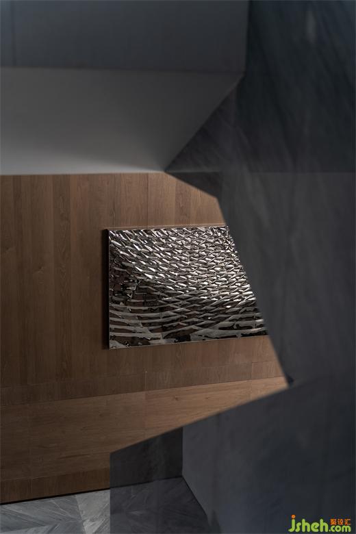 樓梯間藝術(shù)裝置的設(shè)計基于抽象的藝術(shù)暢想,獨特的波浪肌理在層層疊疊的起伏間,將繁復(fù)與簡約平衡至極致,在光的折射下,彌漫著自然的神秘氣氛。