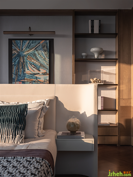 主臥空間雅致幽靜,予人一種放松的享受。皮革構(gòu)成的半包圍型床背,光與影的相互交映,營造出空間溫暖氛圍感。與之搭配的藝術(shù)裝飾畫,生動起伏的肌理感,讓空間變得更現(xiàn)代化、更具有藝術(shù)性。