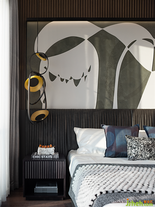 次臥延續(xù)了線性元素,背景墻、床頭柜、黑色褶皺床背及連環(huán)相接的藝術(shù)吊燈,樣板間設(shè)計以重疊、交織、并置的線條,呈現(xiàn)立體的語言風格,勾勒出生活情境的藝術(shù)。