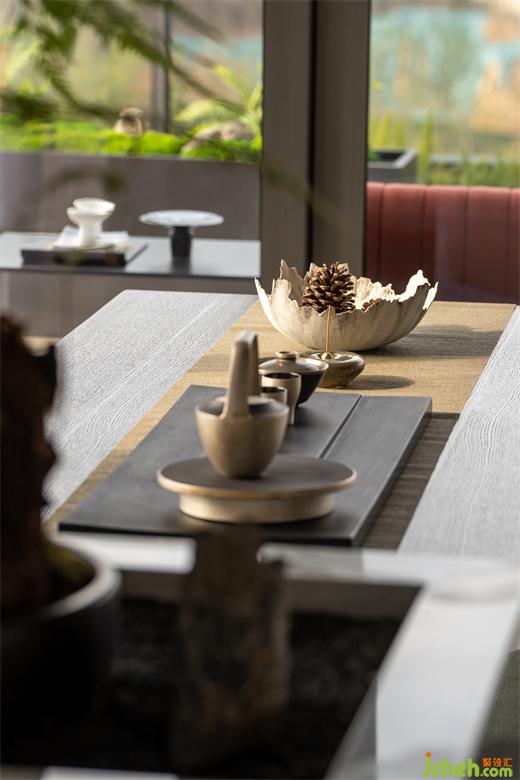 樸拙的茶臺與精致的茶具形成對比,清雅氣息在空間中盎然生長,抒寫曠遠靈動的詩意。