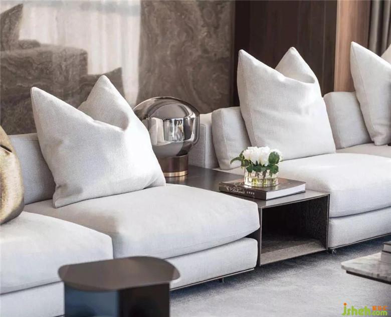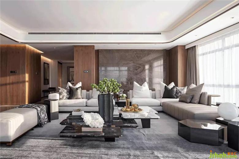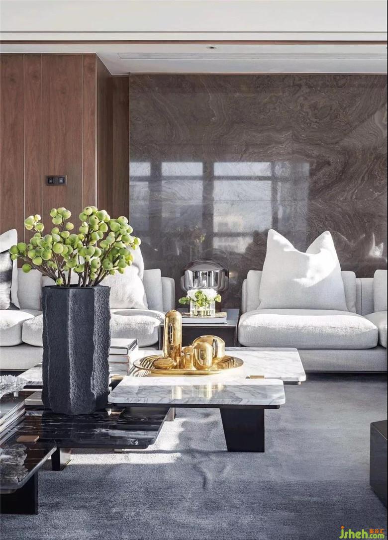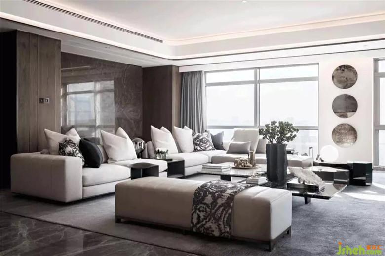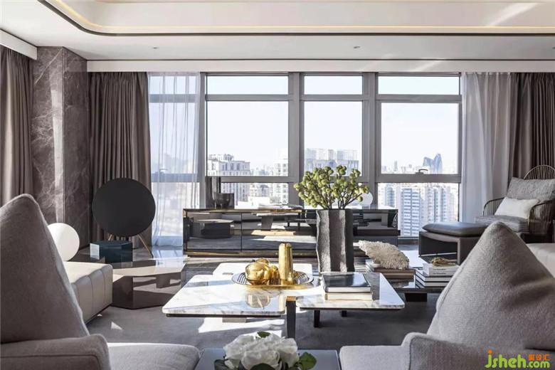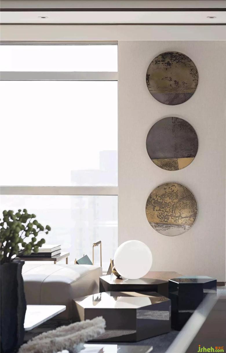 隨之進(jìn)入客廳,三面落地窗承接了陽(yáng)光的洗禮,除極佳的視野外,帶來(lái)溫暖明亮的舒適感。