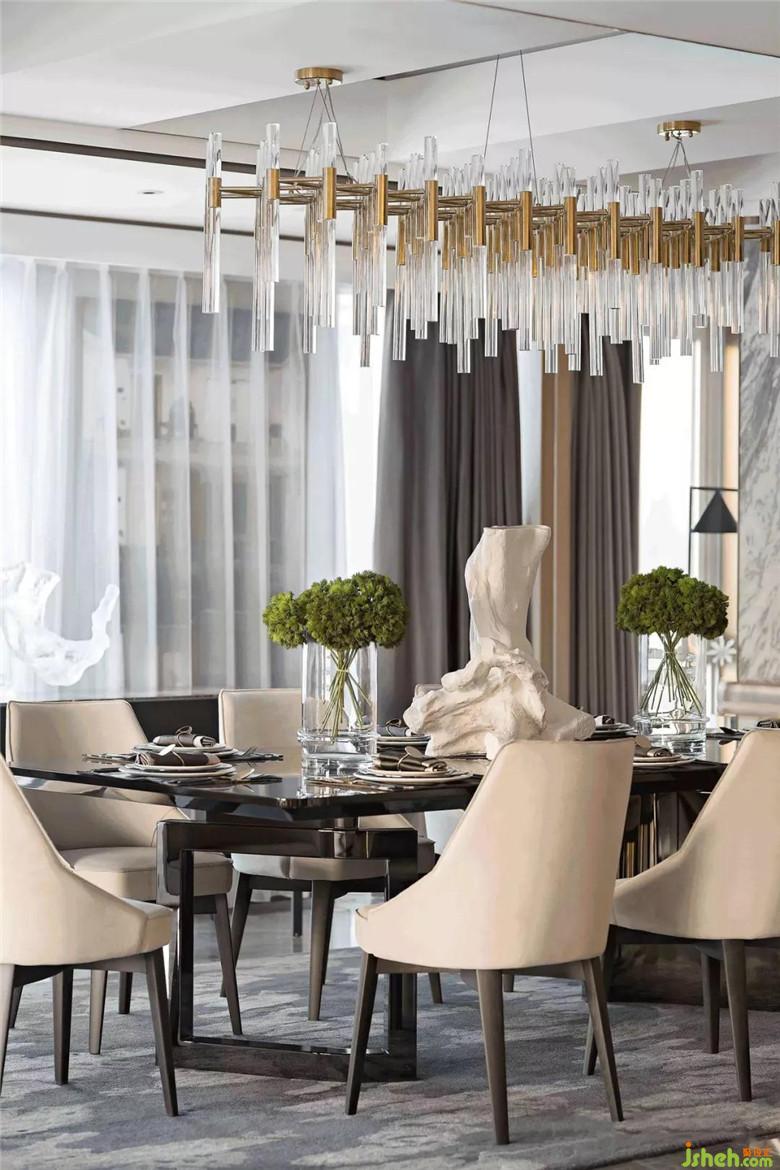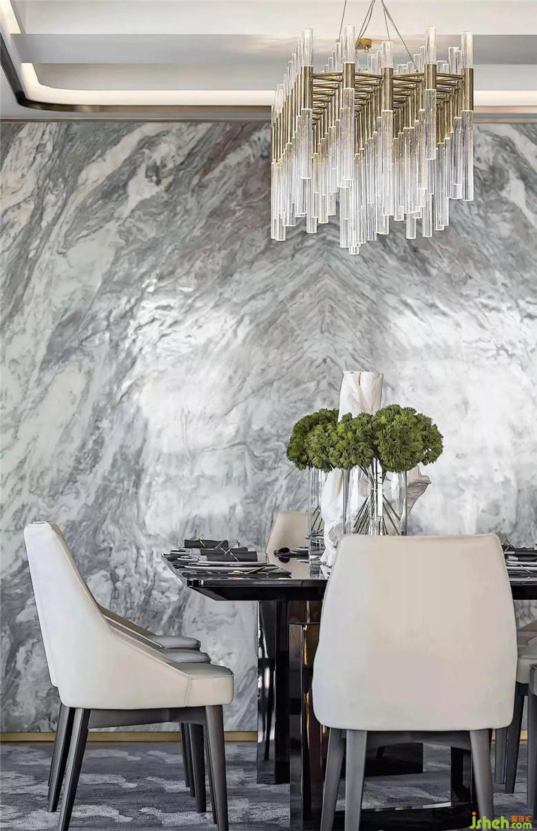 餐廳背景墻以石材襯托空間的凜然大氣,以現(xiàn)豪宅恢弘之感,吊燈以金屬與水晶相銜接,上下錯落有致,在墻體的襯托下,成為饒有趣味的一景。