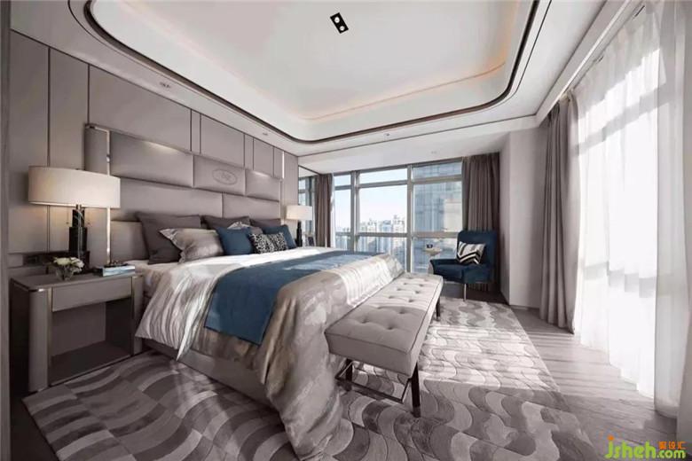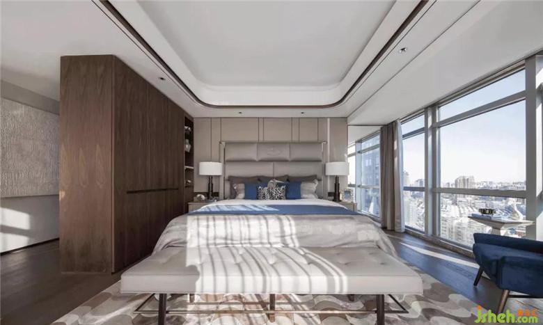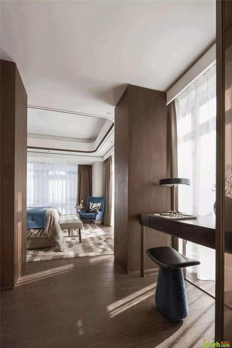 主臥延續(xù)整個空間的格調,以咖色為主搭配柔軟的米白色,再以藍色點綴,并以金屬和皮革打造利落的背景墻,令空間溫厚而沉穩(wěn)。