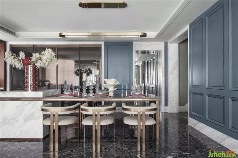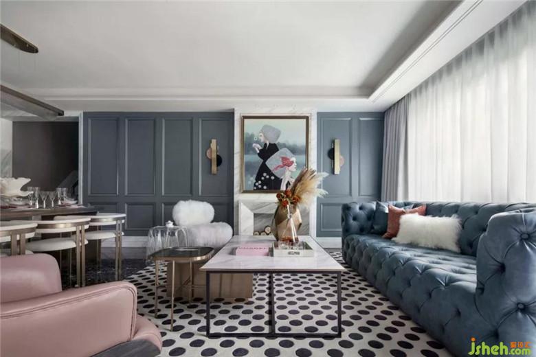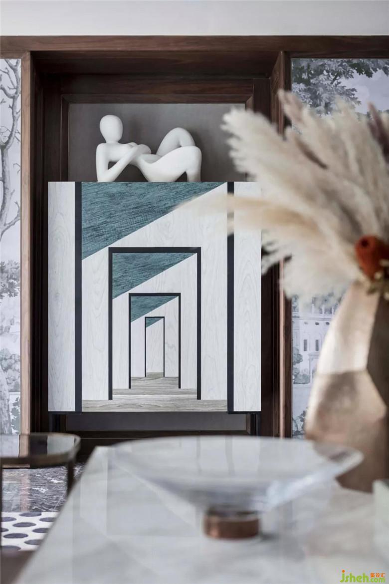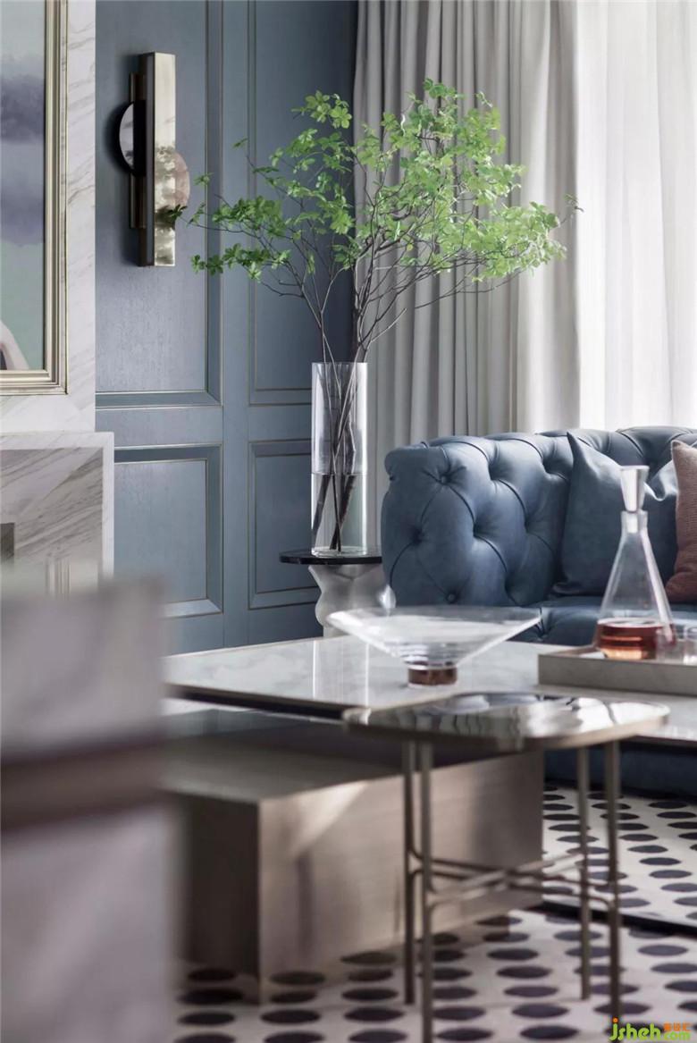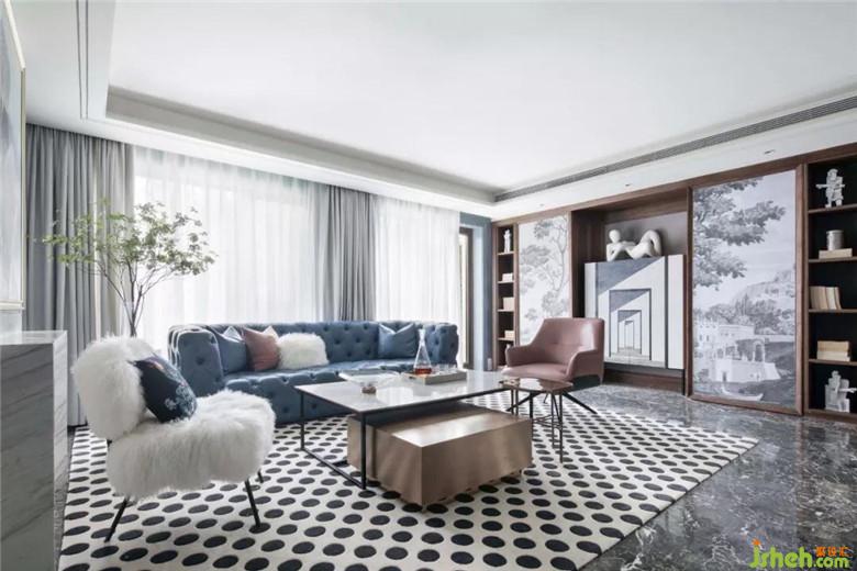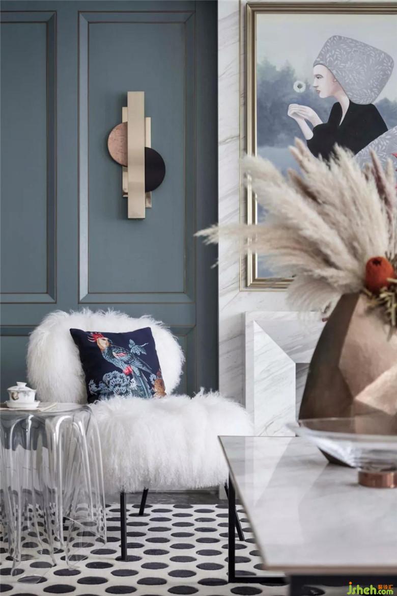 一層客廳色深藍基調下的冷靜搭配橙色單品,突出點亮空間,又汲取中世界文藝復興的一些藝術靈感引入空間,素色軟飾增強了空間呼吸性,復古格調讓空間更有藝術氣息?,F代感家具被賦予更多質感,與精致飾品化身為新藝術潮流。經典圖案的黑白元素,點燃了空間氛圍。