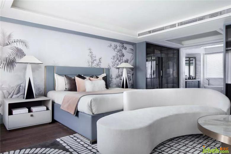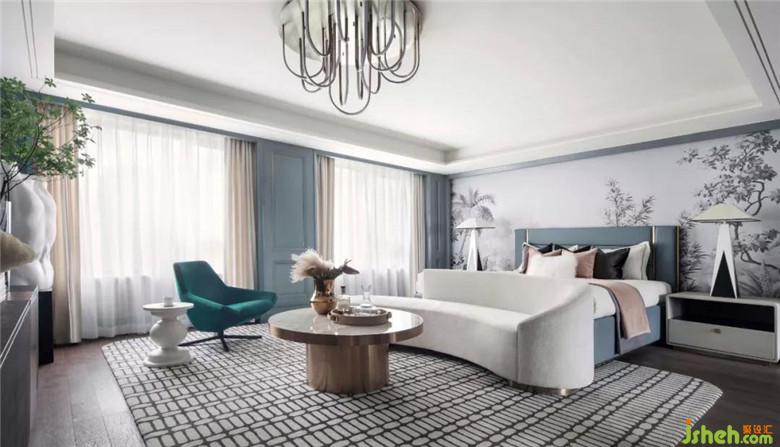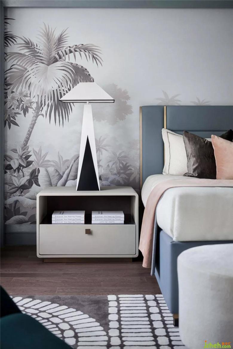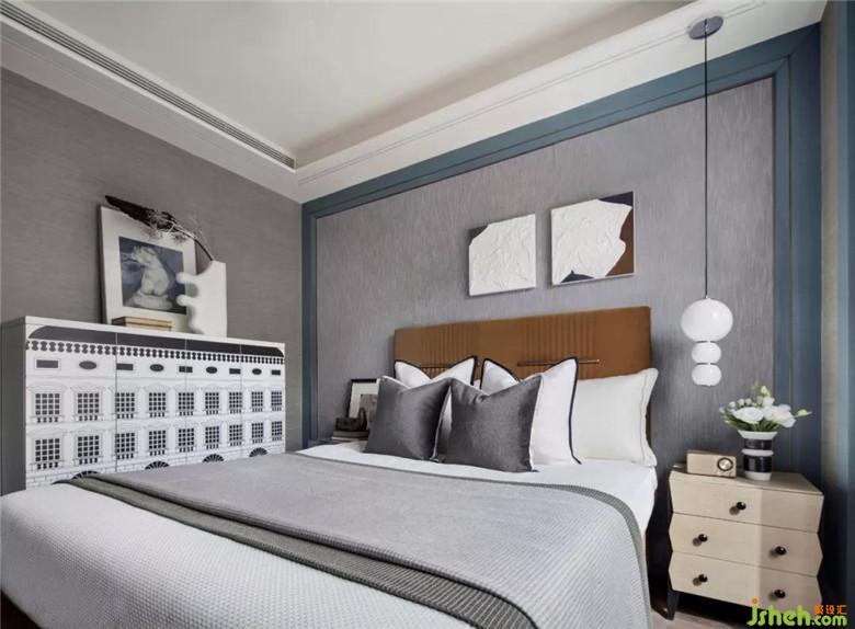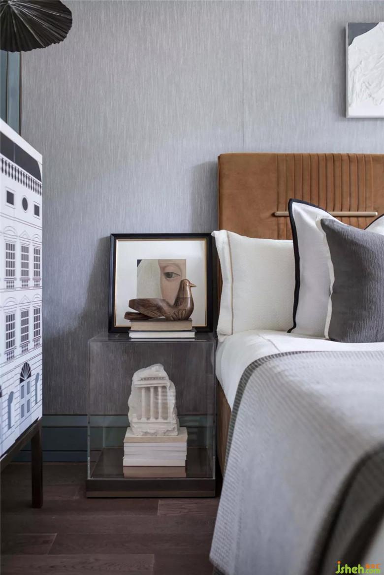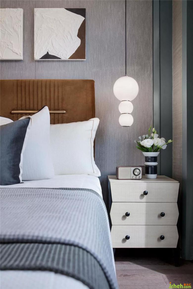 長輩房空間色調(diào)更加穩(wěn)重,選用大量的灰色調(diào),營造空間安靜的氛圍。在寧靜平和的睡眠氛圍中,柔軟的織品更添舒適感。金屬質(zhì)感的鳥與空間主題輝映,幾何燈具打破了深色軟式的沉悶,令空間更為平衡。