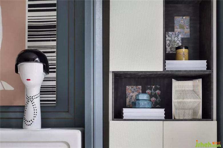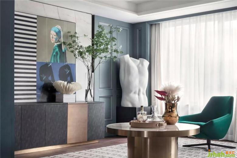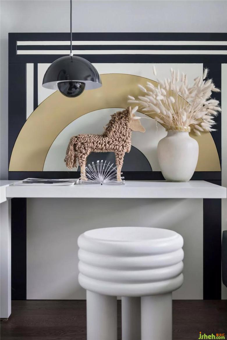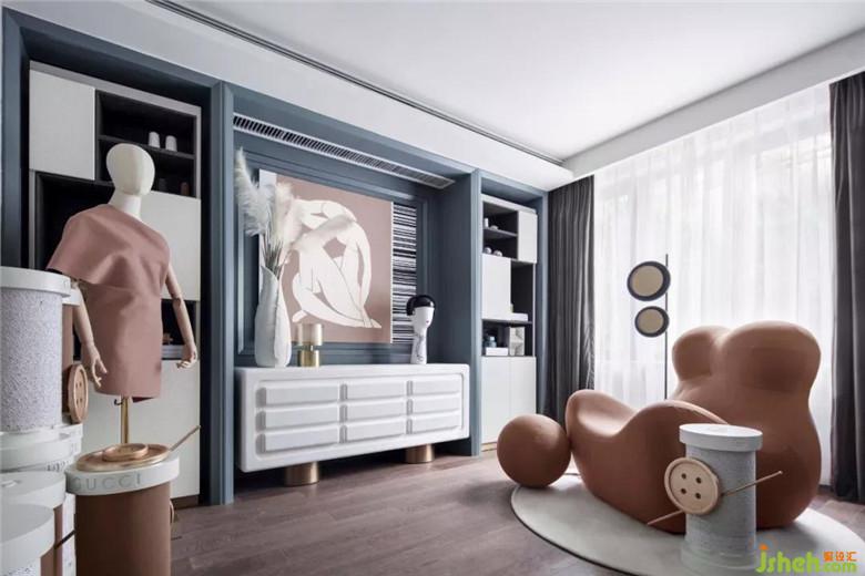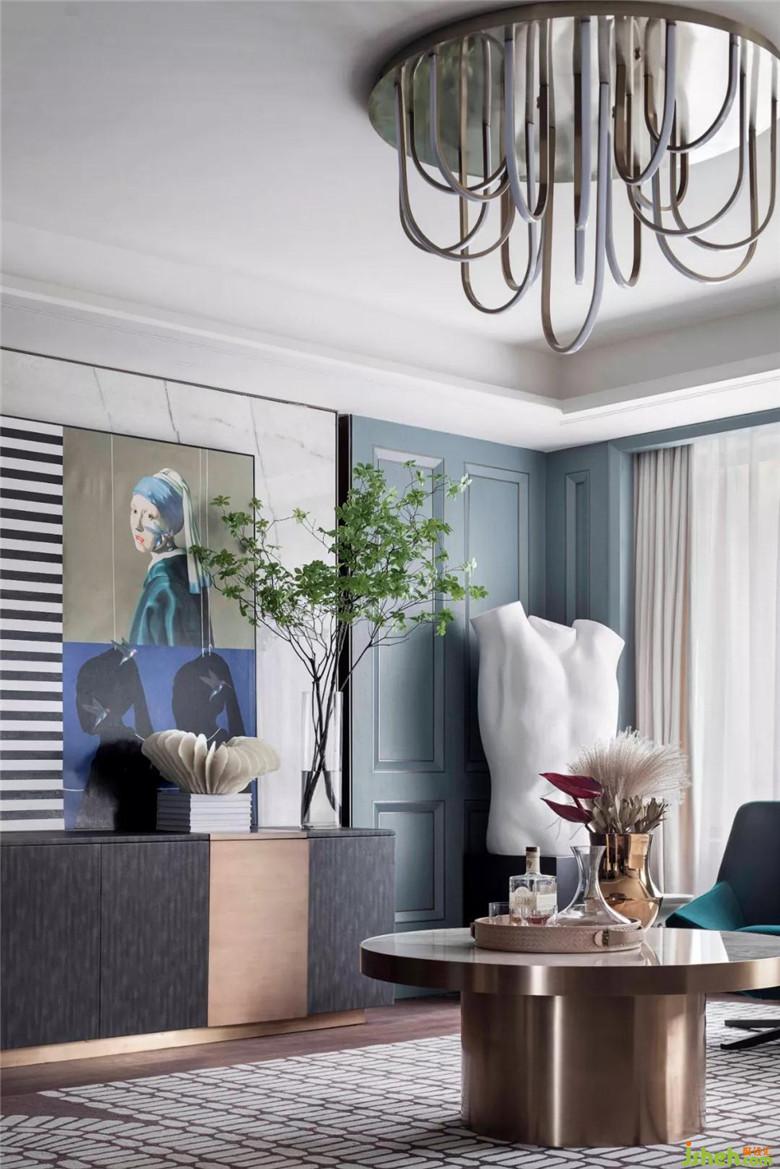 主臥主色調(diào)以藍(lán)色為主,橘粉色作為跳色,臥室圓形金屬茶幾具有闔家歡樂的寓意,大氣中又不失生活的趣味。皮質(zhì)有紋理的軟包,水晶質(zhì)感的璀璨燈具,每一處細(xì)節(jié)都體現(xiàn)著輕奢感。
