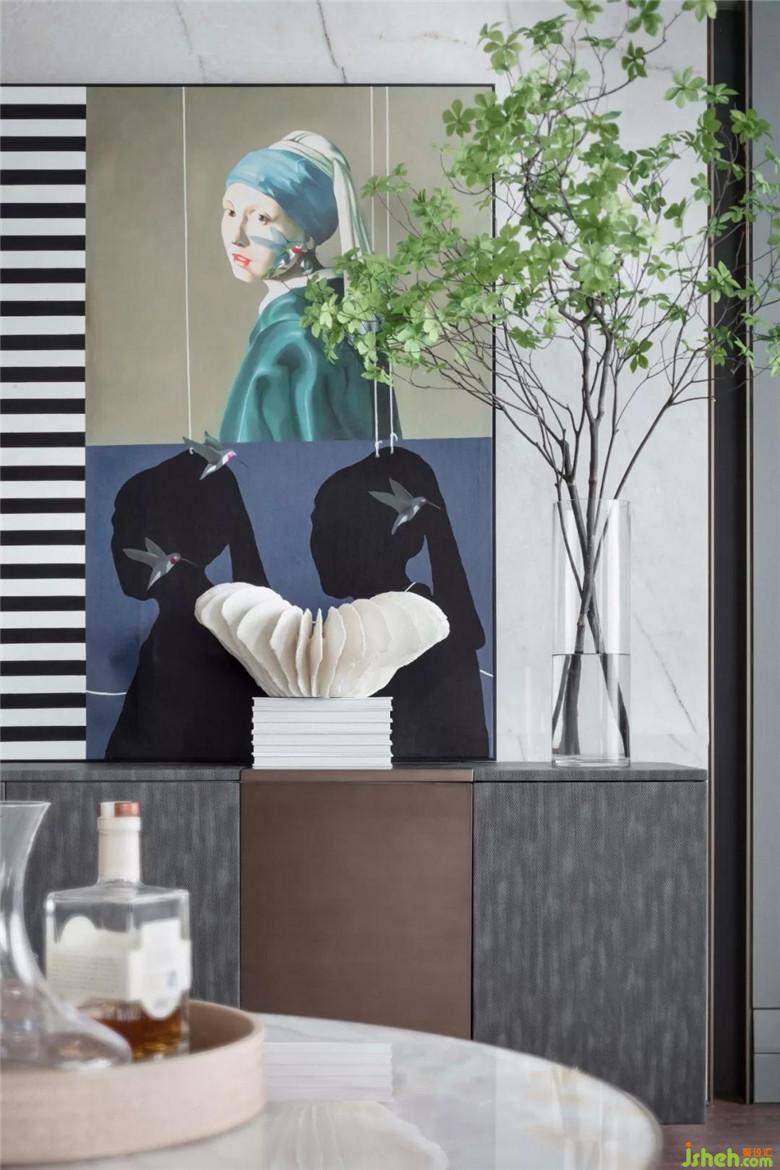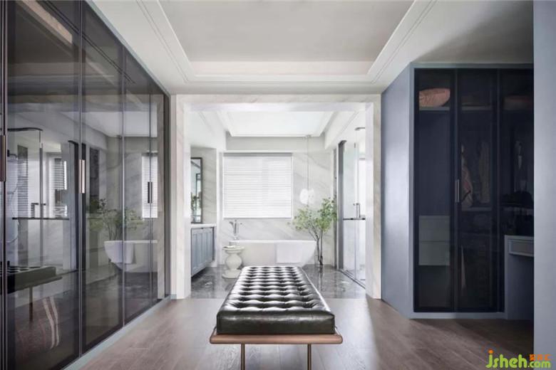 藝術(shù)感不僅體現(xiàn)在空間環(huán)境的營(yíng)造,細(xì)節(jié)的處理和材質(zhì)的選擇也透漏出時(shí)尚氣息。衣帽間衣柜延續(xù)主題的顏色,坐榻的設(shè)置讓空間兼顧收納的基礎(chǔ)上更加人性化,衣柜的玻璃門讓放置的衣服物品一覽無余,與浴室,洗手間也是以玻璃相隔,給予空間通透感。