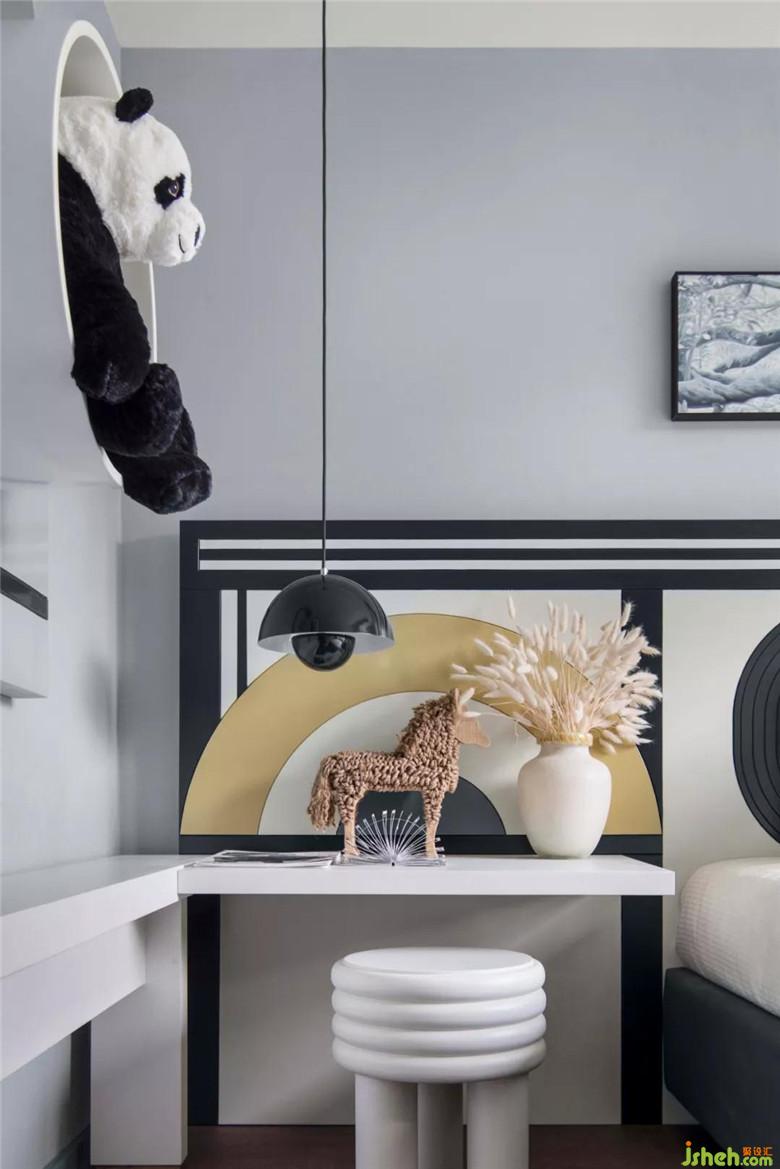 兒童房的清新綠與活躍黃構(gòu)成了屬于孩子的妙想世界,各個(gè)角落的趣味擺件讓這個(gè)空間成為小小城堡。主色也屏棄了鮮艷的色彩,而以添加些許灰度感的莫蘭迪色質(zhì)感著空間。潛移默化中培養(yǎng)著審美情趣的認(rèn)知。