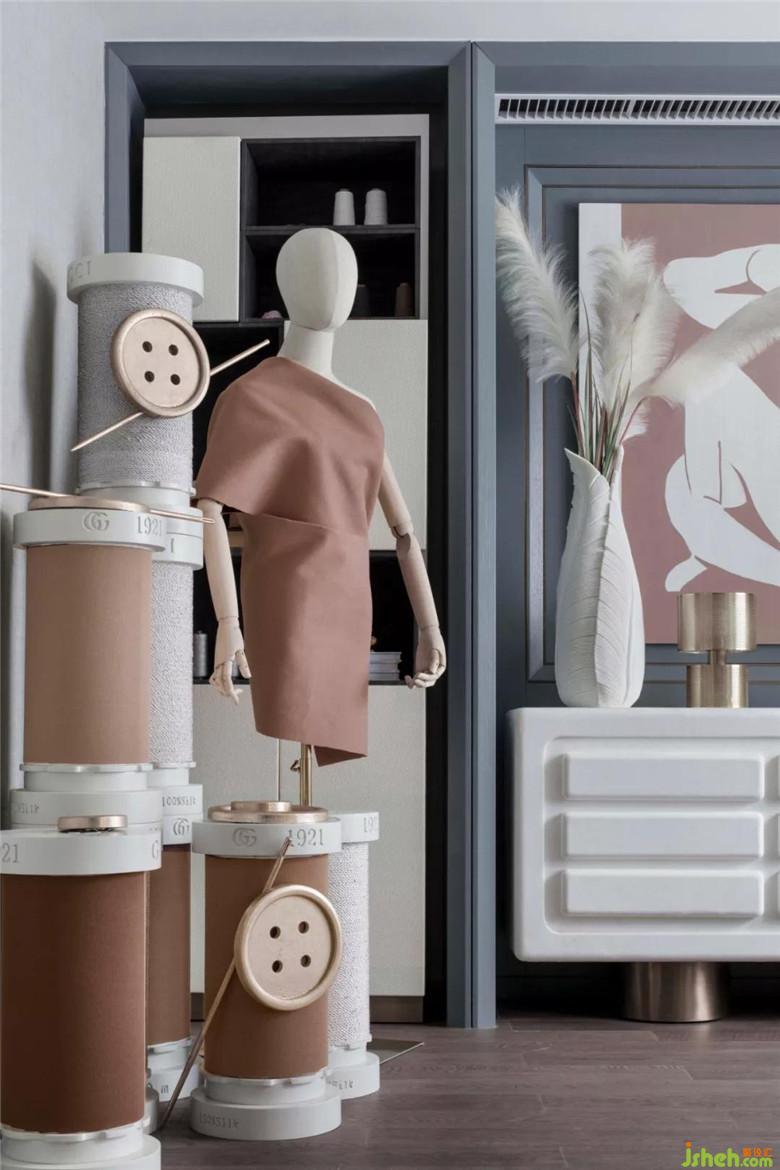 地下一層的書房根據(jù)女主人的需求增加了豐富的功能,服裝設(shè)計(jì)用具與墻面海報(bào)碰撞出時(shí)尚風(fēng)范,以女性的視覺去感知整個(gè)氛圍,兼具時(shí)尚與優(yōu)雅,用沖擊力比較強(qiáng)的配色,不規(guī)則的配件與小軟飾,椅子等如同上演著一場(chǎng)華麗低調(diào)的時(shí)裝秀,給人以靈感沖擊。