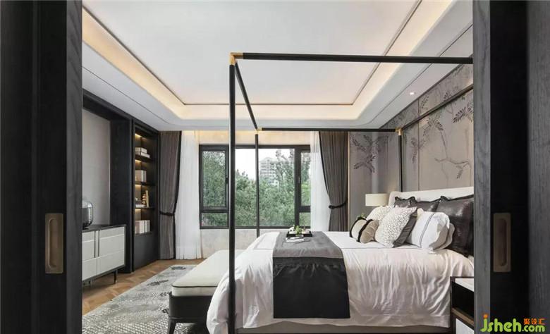 在老人房的處理上,窗前的遠山景色被凝練于高低錯落的屏風之上,青松盆景、墻上金屬葉片自然的元素與生活的崇高詩意在此融為一體。