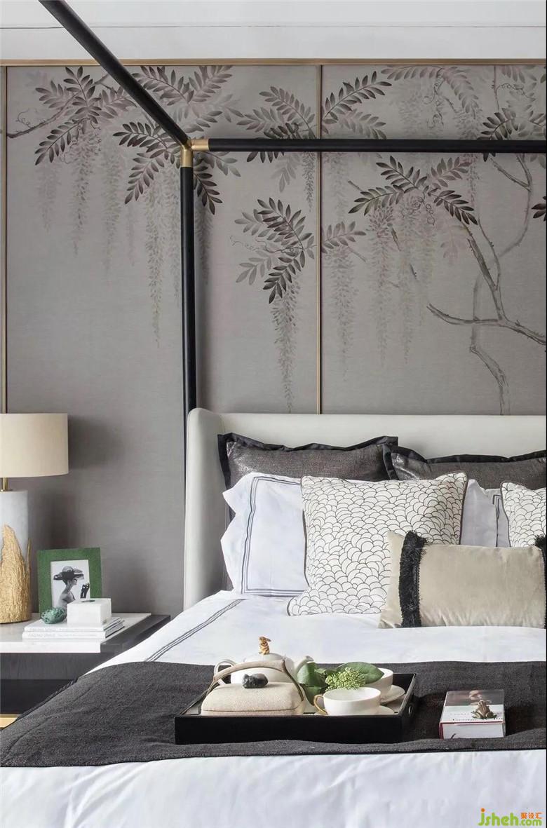 主臥的灰綠色真絲墻面,是蔓藤手繪畫作的背景,從窗簾、床榻、植物到藝術裝置,這一抹寧靜且深沉的綠,娓娓道來的,是空間之生命力。