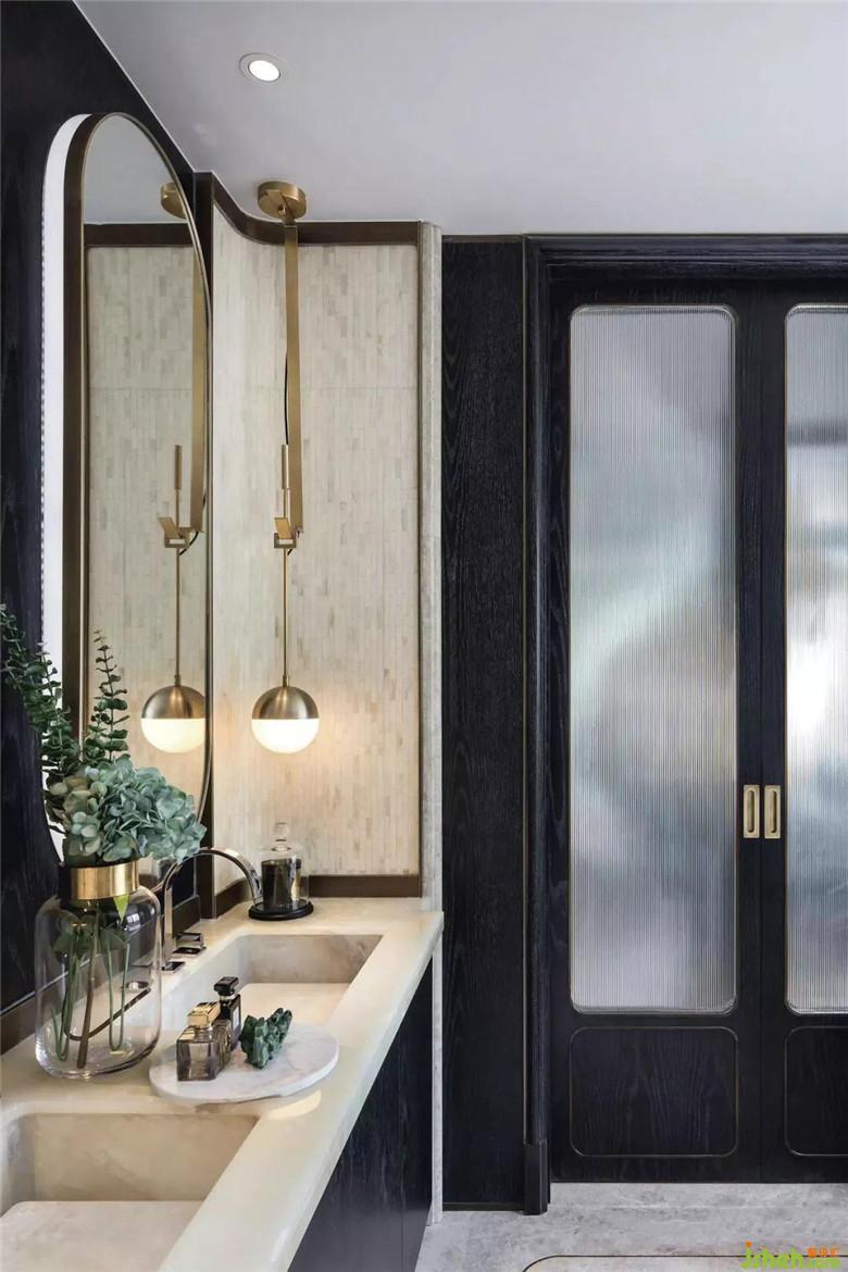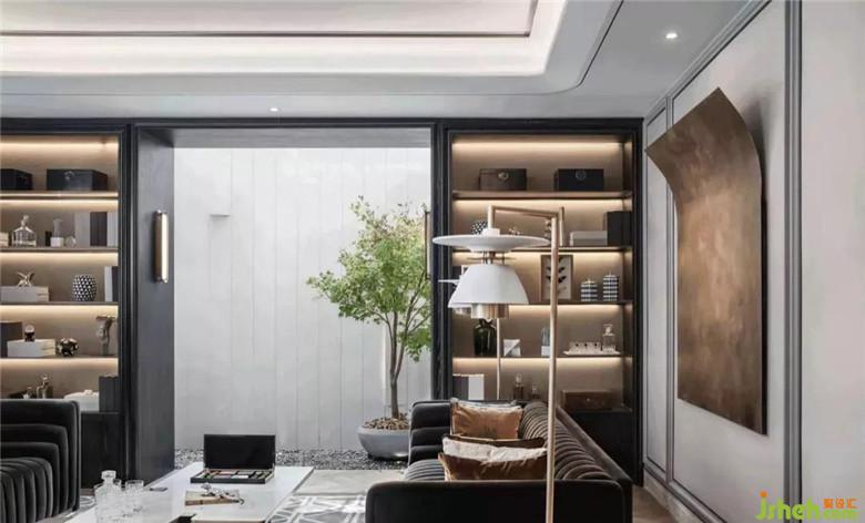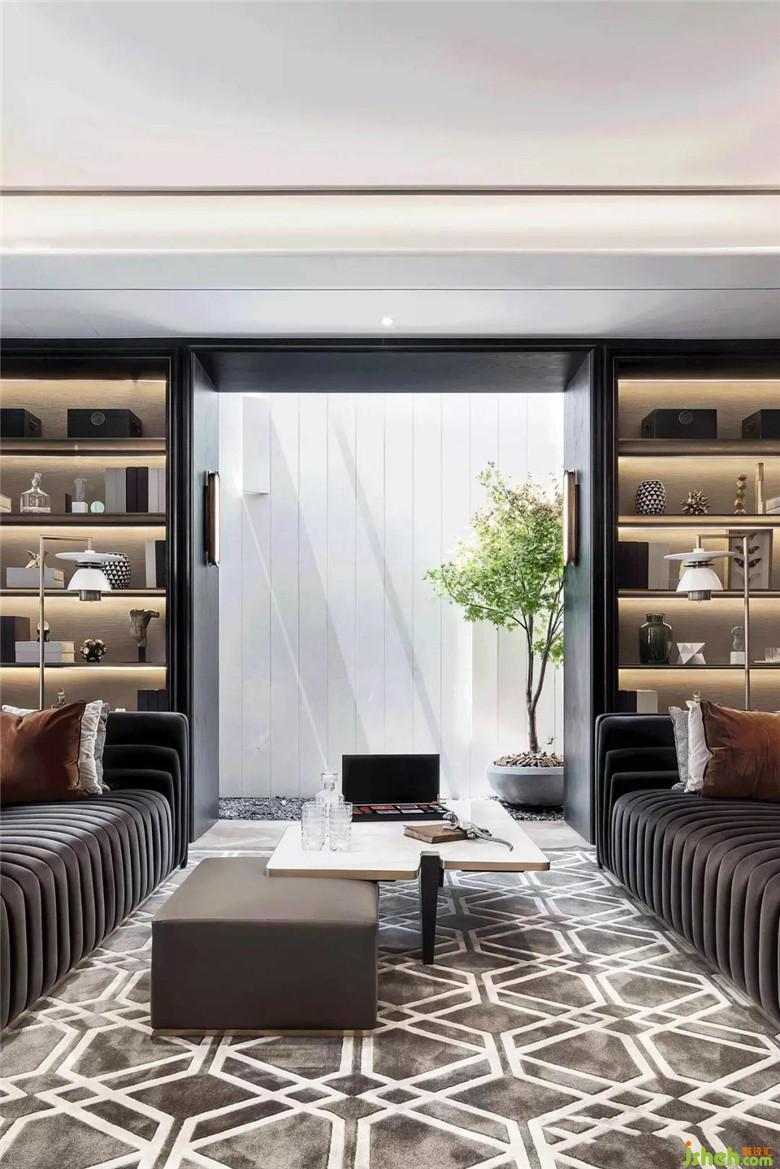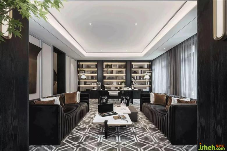 深色的書柜墻面,被柔和的隔板燈光打亮,橫向線條更與空間的書香氣韻共同突顯。