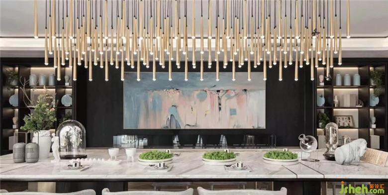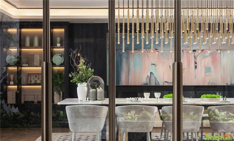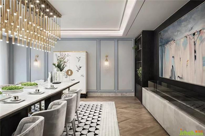與書房區(qū)不同,線條的呈現(xiàn)方式,在女主人的下午茶空間變得溫柔了許多。從地毯的扇形拼接、線型吊燈的錯(cuò)落秩序,到座椅的優(yōu)雅姿態(tài),將當(dāng)代東方女性的韻味淋漓展現(xiàn)。