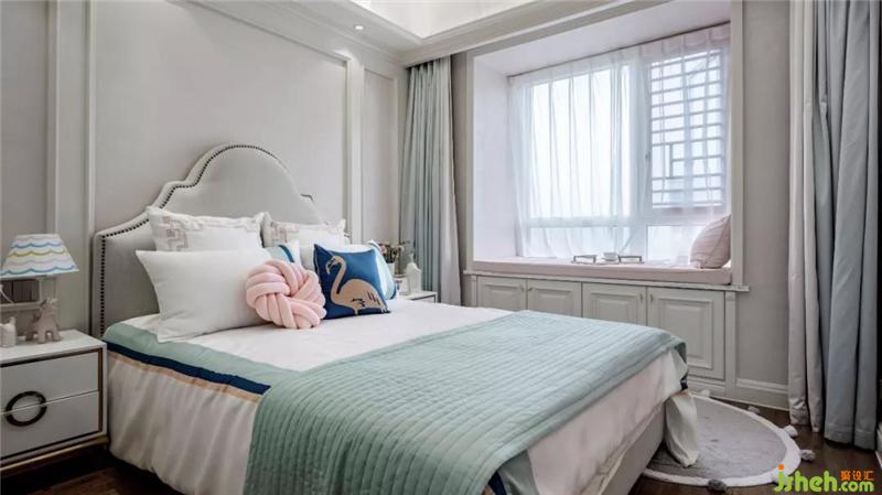 孩童臥室整體風(fēng)格與主臥相差不大,整個(gè)空間光線得到了有效滿足,粉色給空間增添了一份童真與少女感。