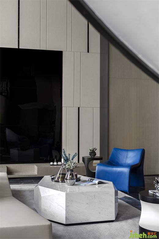 樣板房設(shè)計(jì)師利用社交群體記憶與空間的關(guān)聯(lián)轉(zhuǎn)化,建立起新的空間體驗(yàn)感,大膽利用黑色突出空間的嚴(yán)肅感,淺咖色系調(diào)整空間溫度感,用寶藍(lán)色增添空間活躍性,使人們對熟知的實(shí)物產(chǎn)生新的興奮感和舒適感,連接生活與藝術(shù),商務(wù)與圈層,打造屬于精英圈層的精神場域。