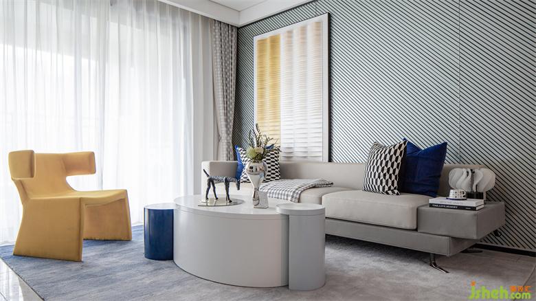 藝術(shù)造型的茶幾、芥末黃色的單人沙發(fā)、幾何元素的抱枕、線條背景墻、湖水般藍(lán)色的地毯將這些元素柔和在同一個(gè)畫面里,客廳舒適又和諧。