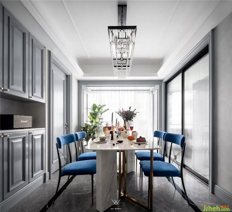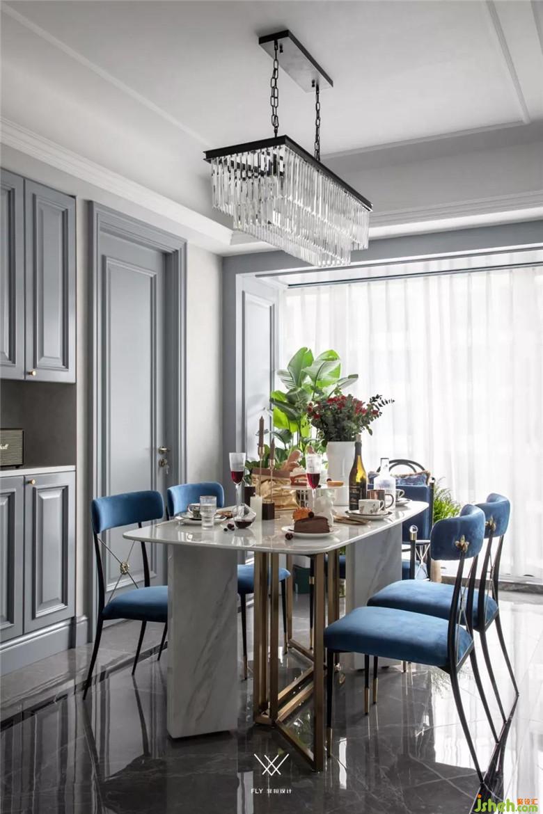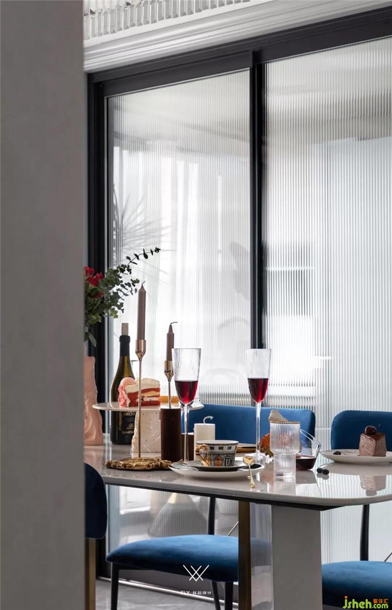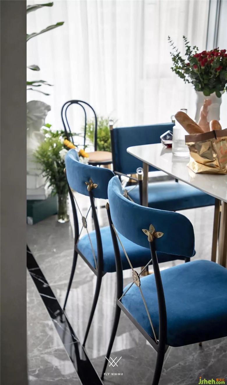 用色彩更加柔性介入我們的空間環(huán)境,物品陳設(shè),衣食住行的方方面面,色彩除了傳遞美感之外更重要的的傳遞情感情緒,讓我們悠然進(jìn)食,安然入睡,專注工作。業(yè)主對(duì)輕奢情有獨(dú)鐘,而且喜歡充滿深邃的藍(lán)色,所以設(shè)計(jì)師首先給風(fēng)格定位出了優(yōu)雅輕奢的感覺(jué)。為了恰到好處表達(dá)它們,而且要加入藍(lán)色,在運(yùn)用色彩的時(shí)候就需要非??酥疲灰屗鼈兪テ胶庖灾劣谧兊倪^(guò)“奢”。