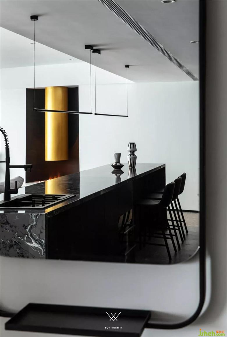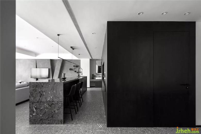 吧臺(tái)式的餐廳與客廳相鄰,鋪之以開放式的西廚空間,可以拉近居住者們的距離。水磨石的地面、極簡(jiǎn)的餐桌造型,都流露出最質(zhì)樸的魅力。