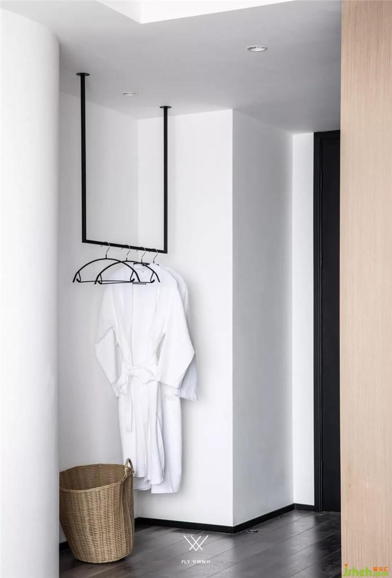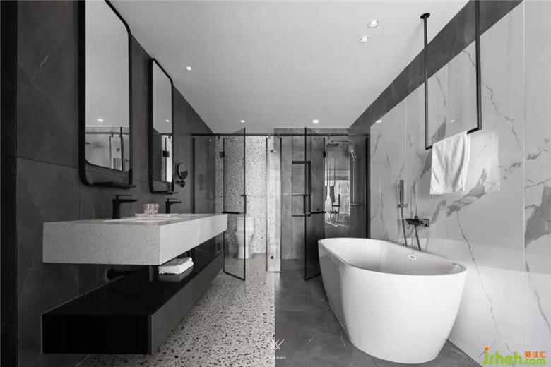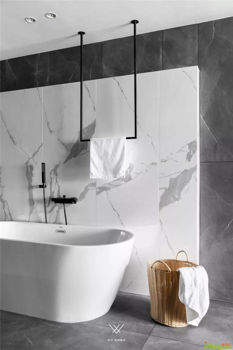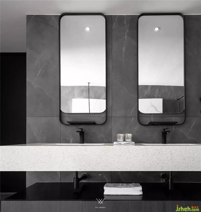 主衛(wèi)采用黑白灰的極簡配色,給人整潔規(guī)則的感官體驗。毛巾架、鏡子、門框,都采用了較為棱角感的線條設計,水磨石和魚肚白磚的搭配,更使得整體效果顯得很有“脾氣”,仿佛不被世俗磨圓棱角。