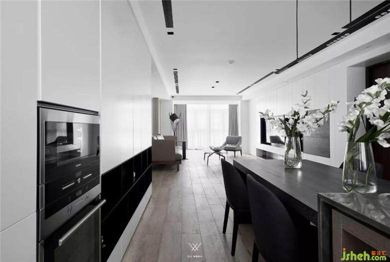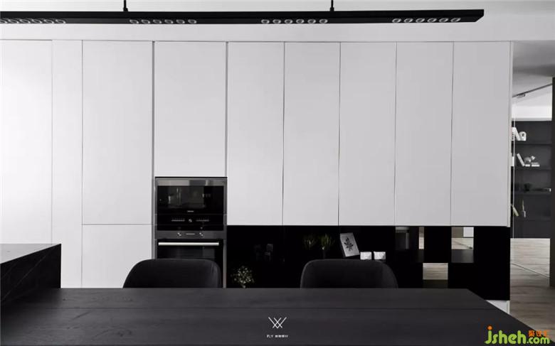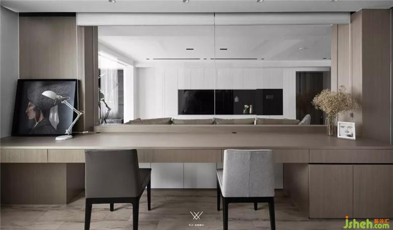 餐廳也采用極簡風(fēng)的設(shè)計,為了增加質(zhì)感,餐桌基層、乃至飾面的強(qiáng)化地板都選擇了極為精致的材料,均由木匠師傅手工制作,匠心獨妙。