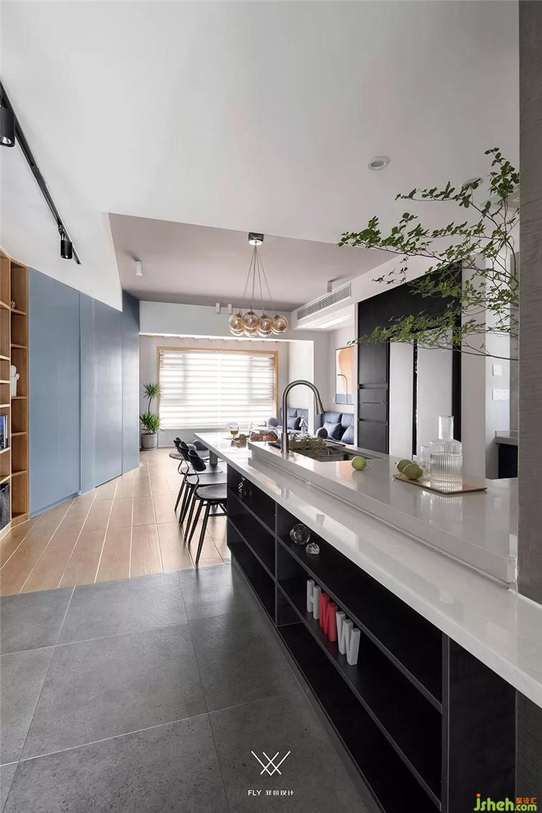 客餐廳地板選用木質(zhì)紋理的地磚,既有木質(zhì)的溫馨感又易于打理。頂部的灰從色彩上優(yōu)化空間層次,巧妙生成與廚房的區(qū)隔。裝修公司將陽(yáng)臺(tái)納入客廳擴(kuò)展公共空間,滿足業(yè)主想要的多一些孩子的活動(dòng)空間和互動(dòng)空間的同時(shí),提升空間的體量感。
