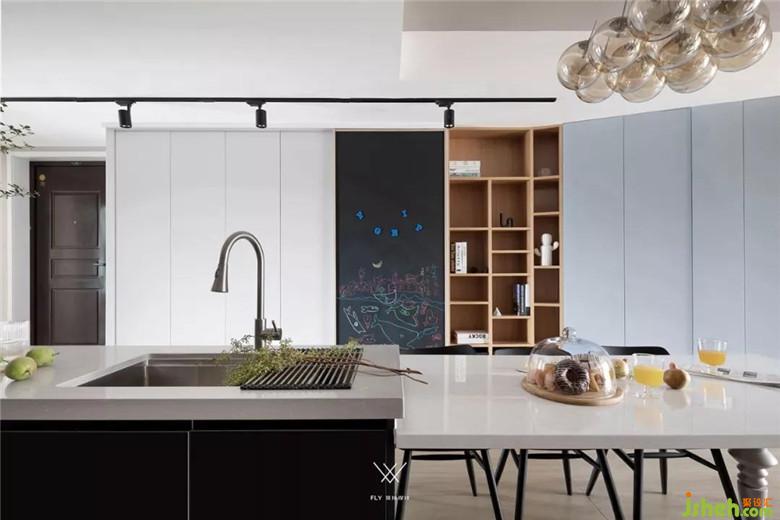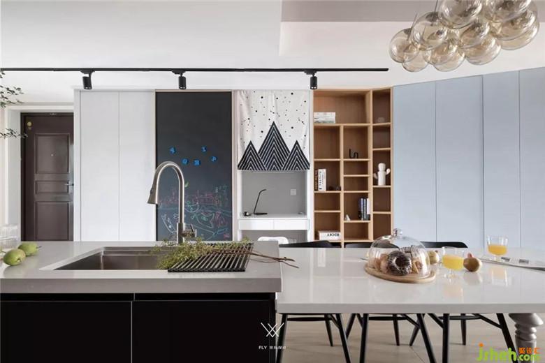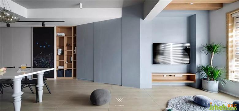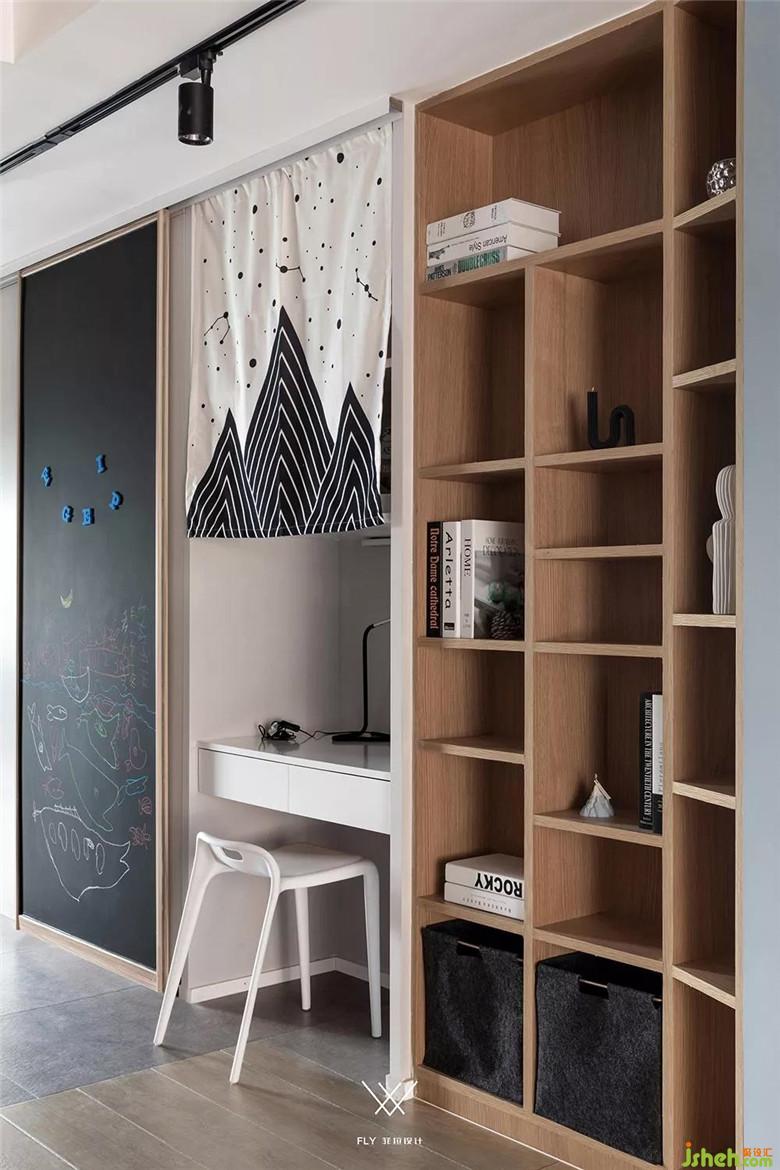 男業(yè)主是橋梁設(shè)計師,專業(yè)書較多,小孩子喜歡畫畫,所以客廳儲物柜做書架有足夠放書的空間。以及隱藏式書桌、書柜。移門又飾以黑板漆,極致發(fā)揮每一寸空間。