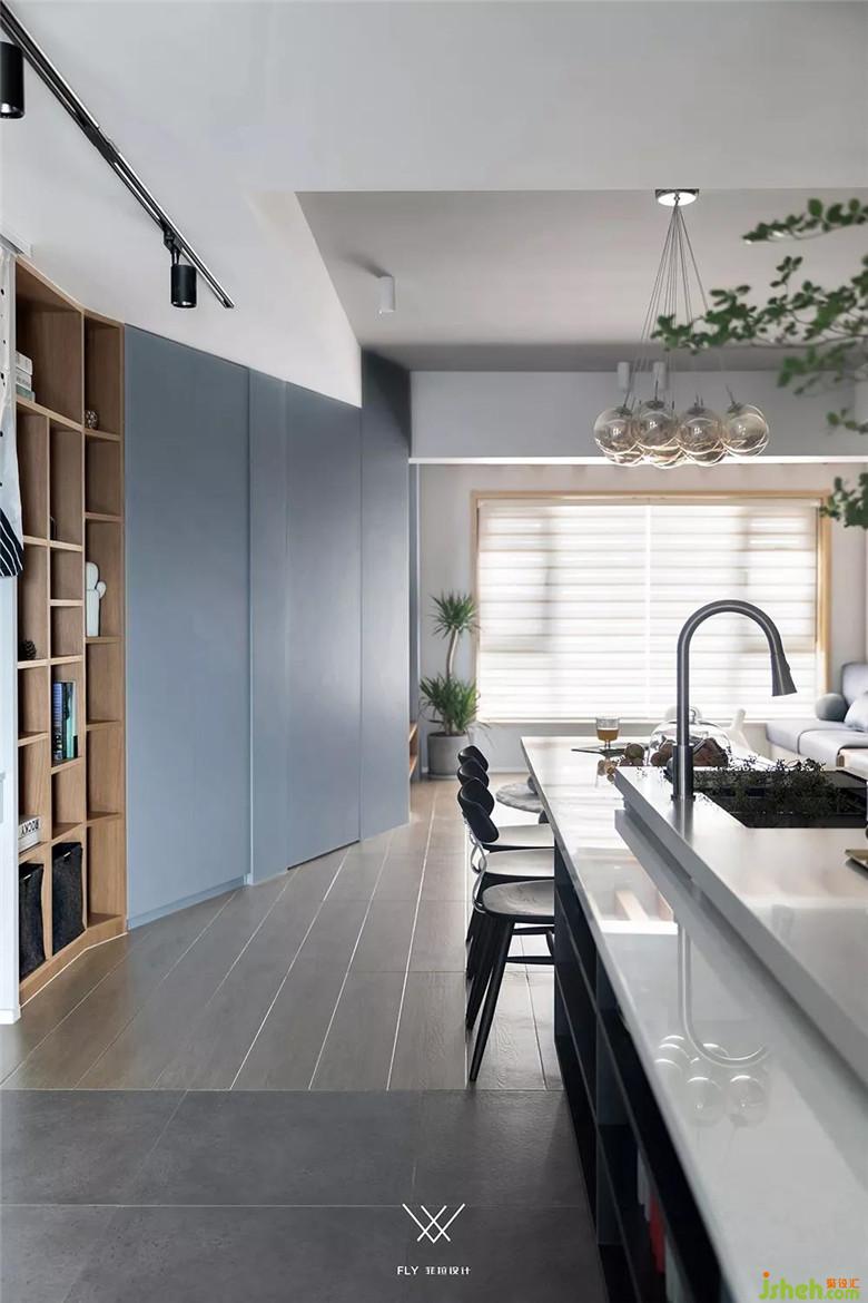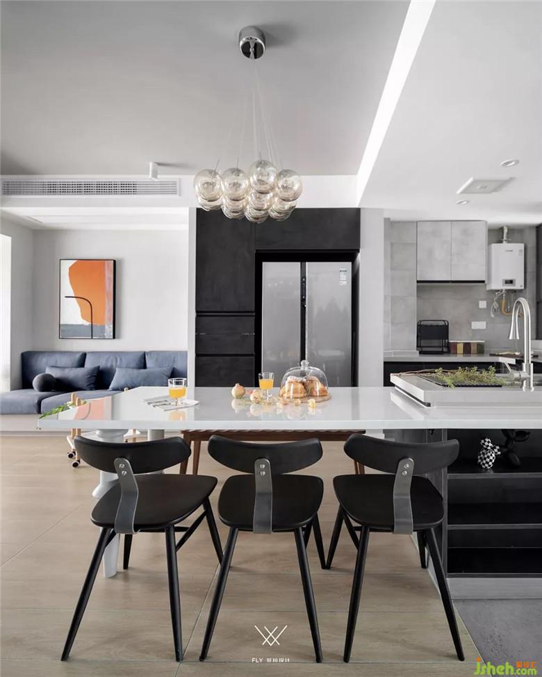 銜接島臺的餐桌,近廚房一側(cè)采用條凳,視覺上的無阻礙尤顯通透,且節(jié)省過道面積方便廚房操作。
