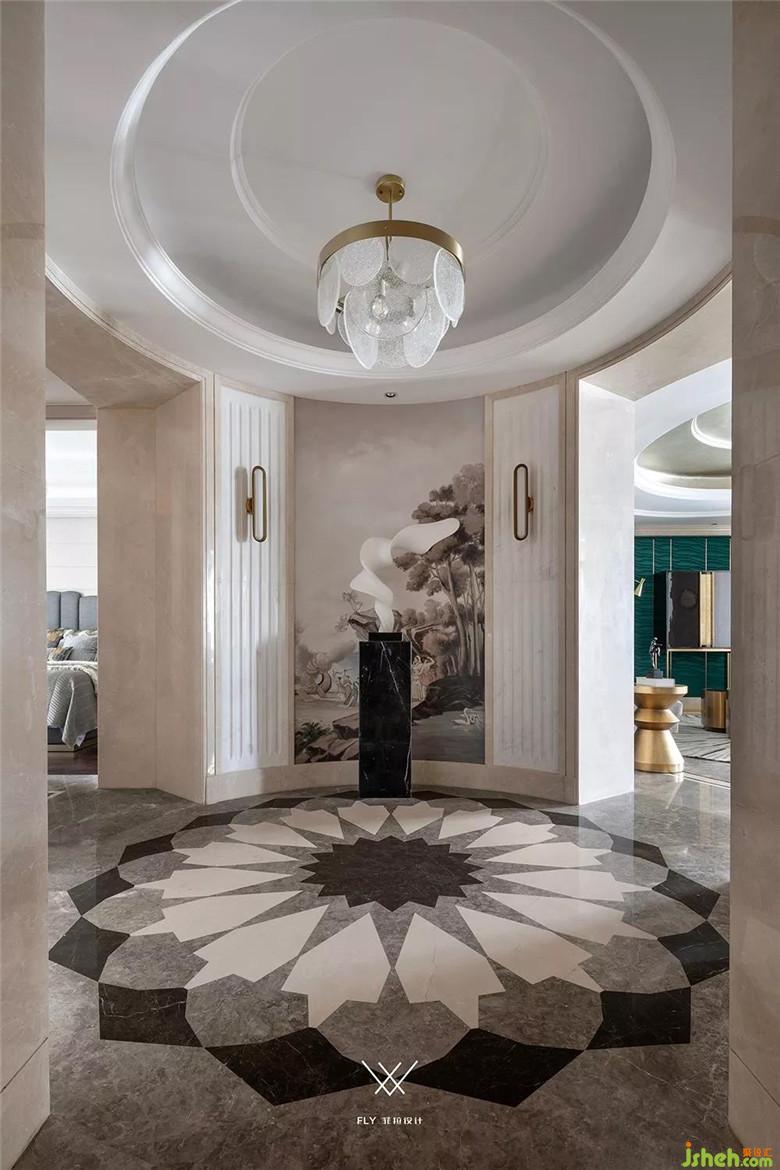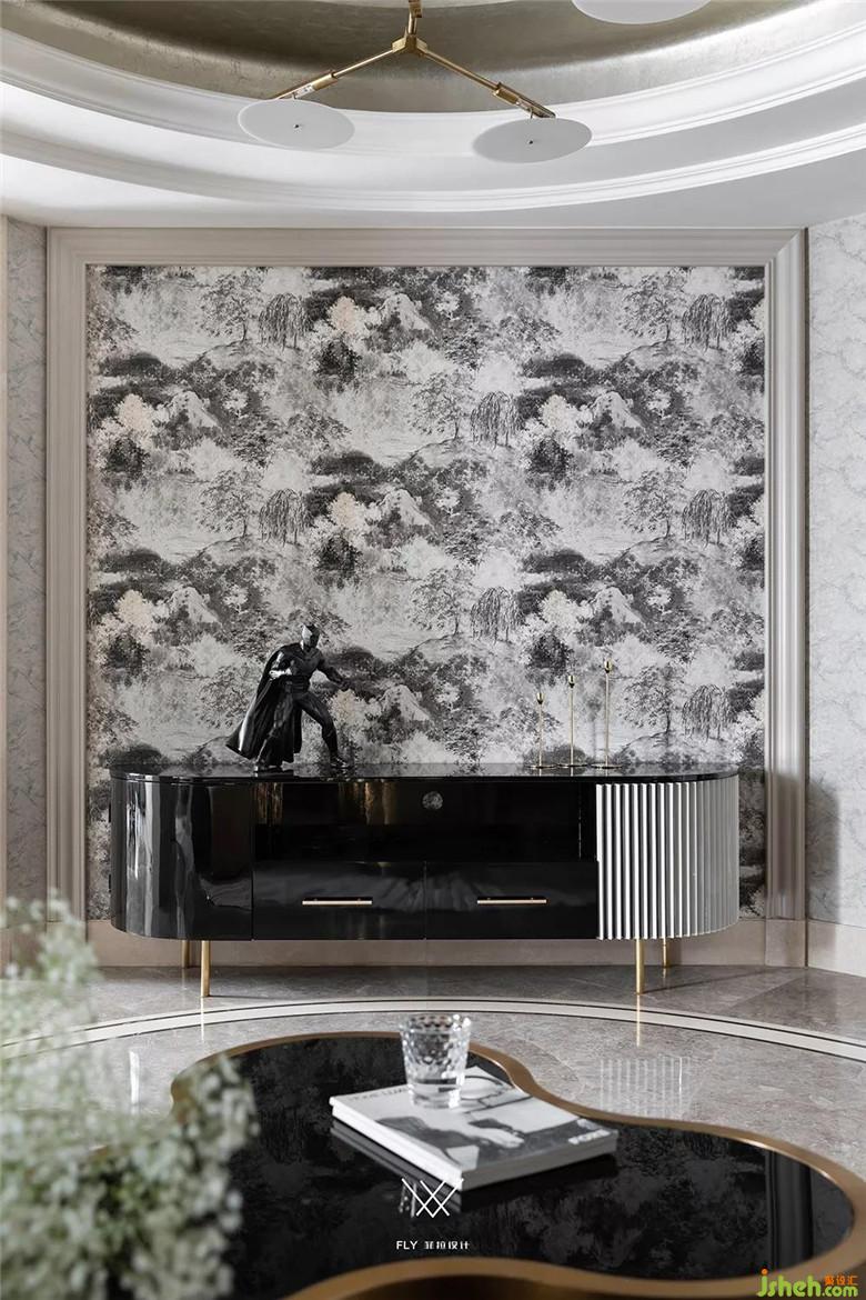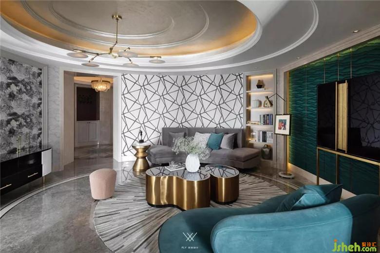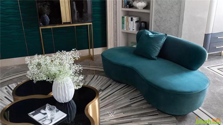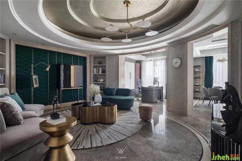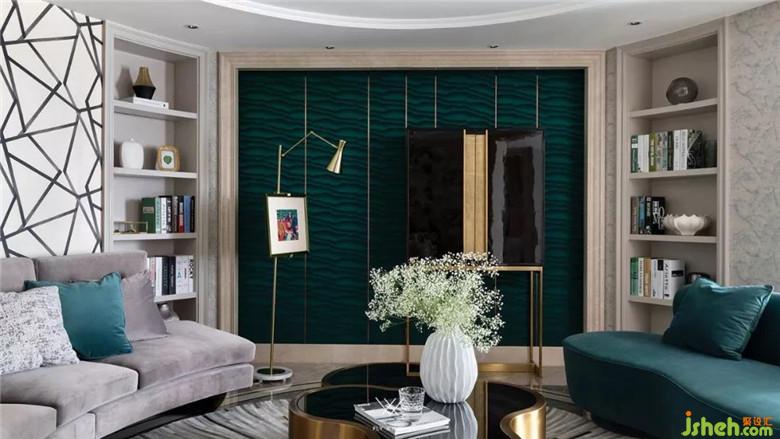 客廳不僅僅承載其自身的功能,而且還是連接餐廳、書房的樞紐。所以為了體現(xiàn)出既有整體又有分散,更多以一種聚合的形式出現(xiàn),我們摒棄了常規(guī)的家具擺法,通過異形沙發(fā)和組合茶幾營造一個(gè)圓形的圍合氛圍。原有的硬包、墻紙款式和色調(diào)過于沉悶保守,更換墨綠色墻紙與主背景的硬包款式,在色彩上和家具貫穿起來。
