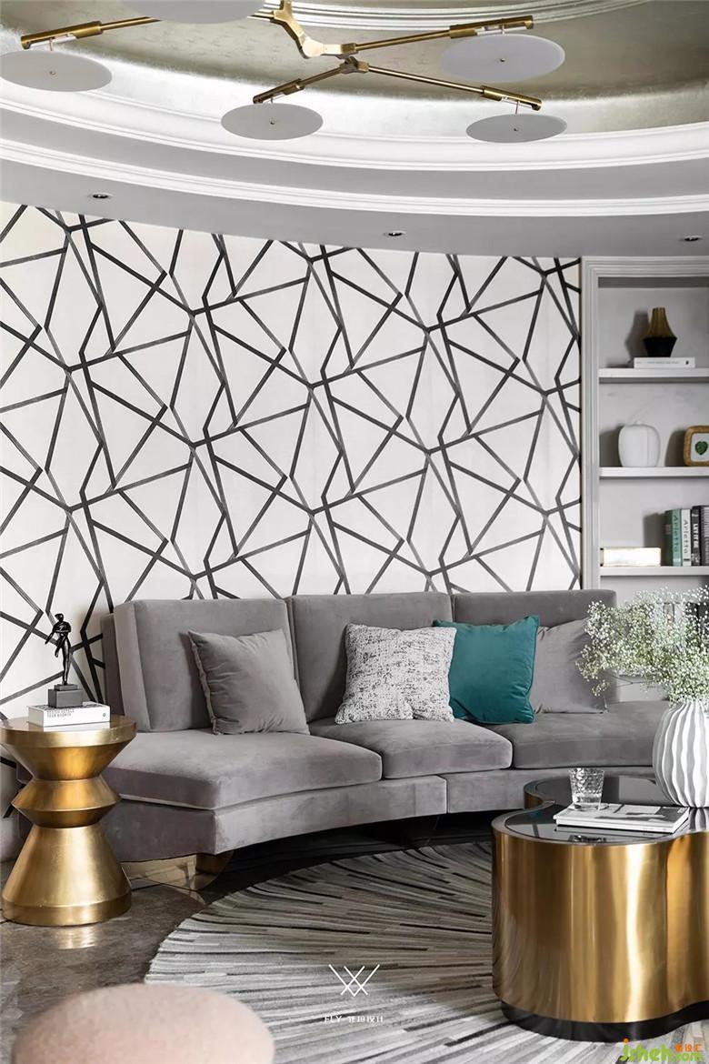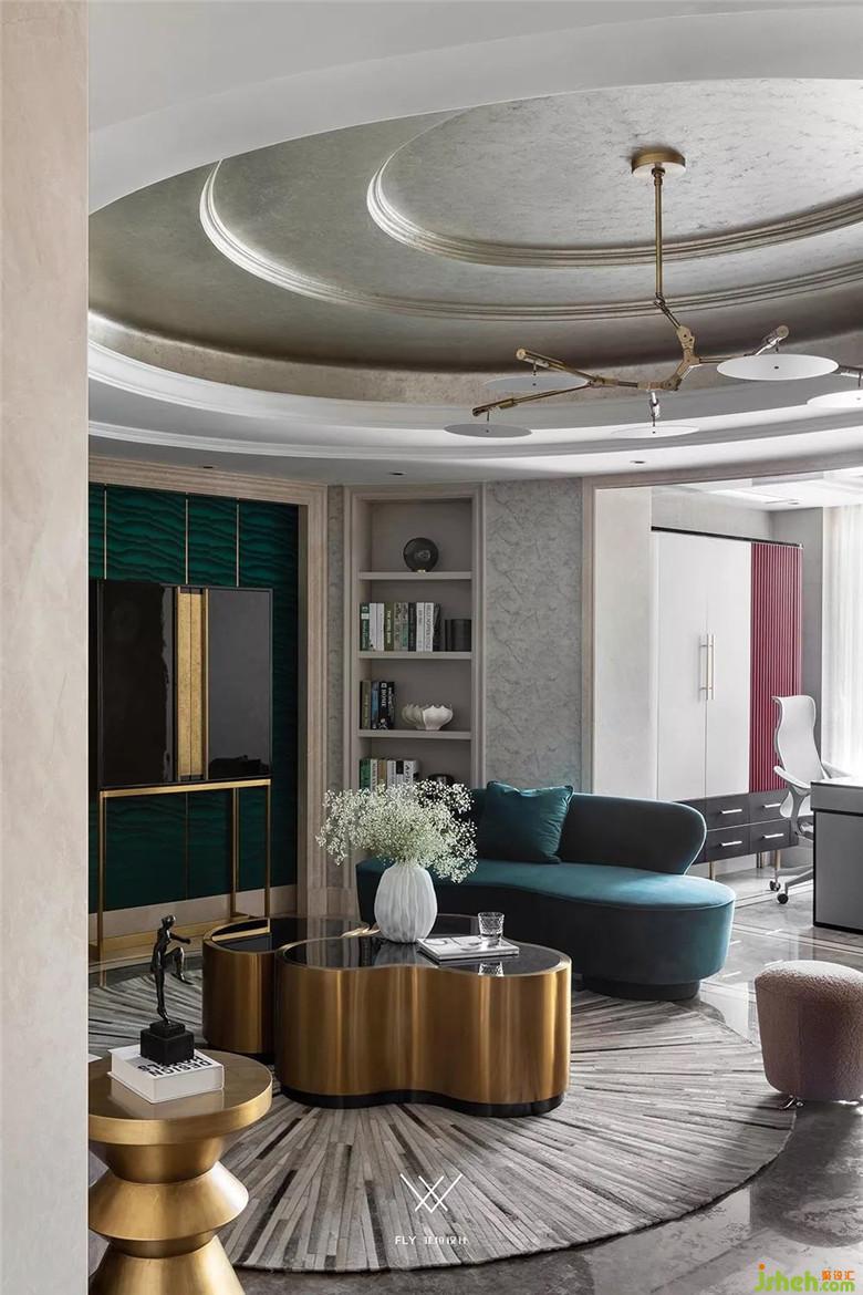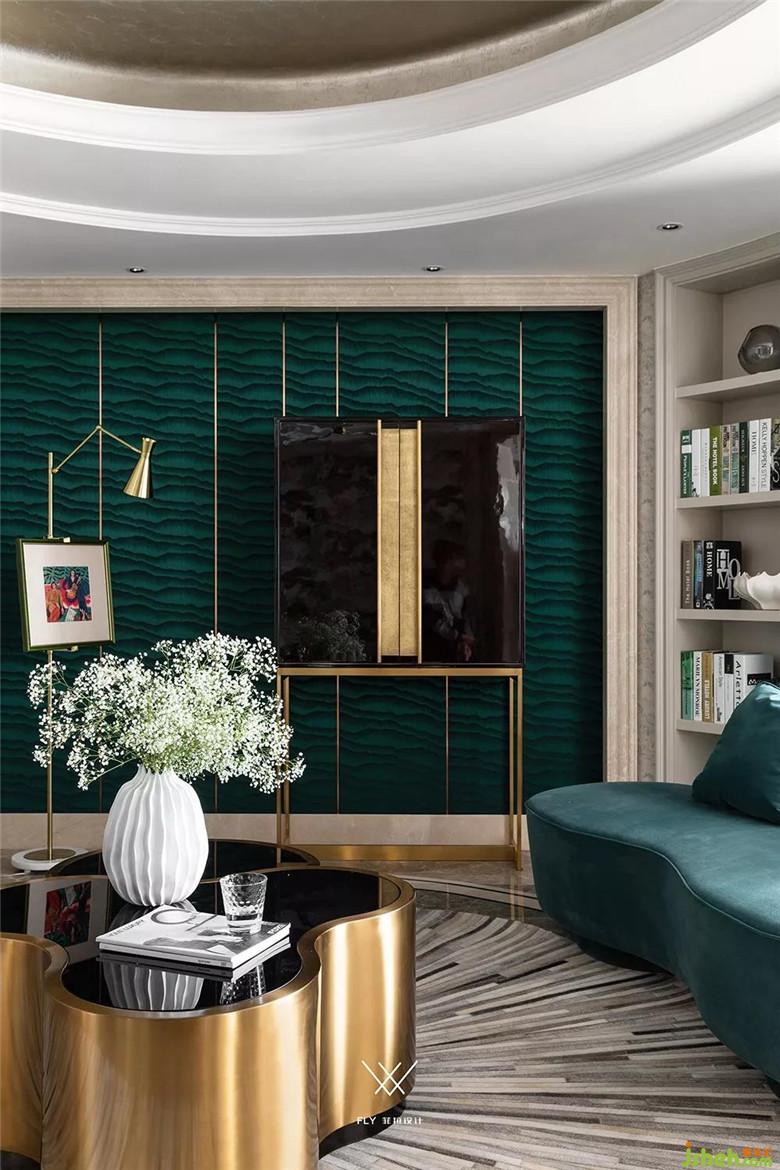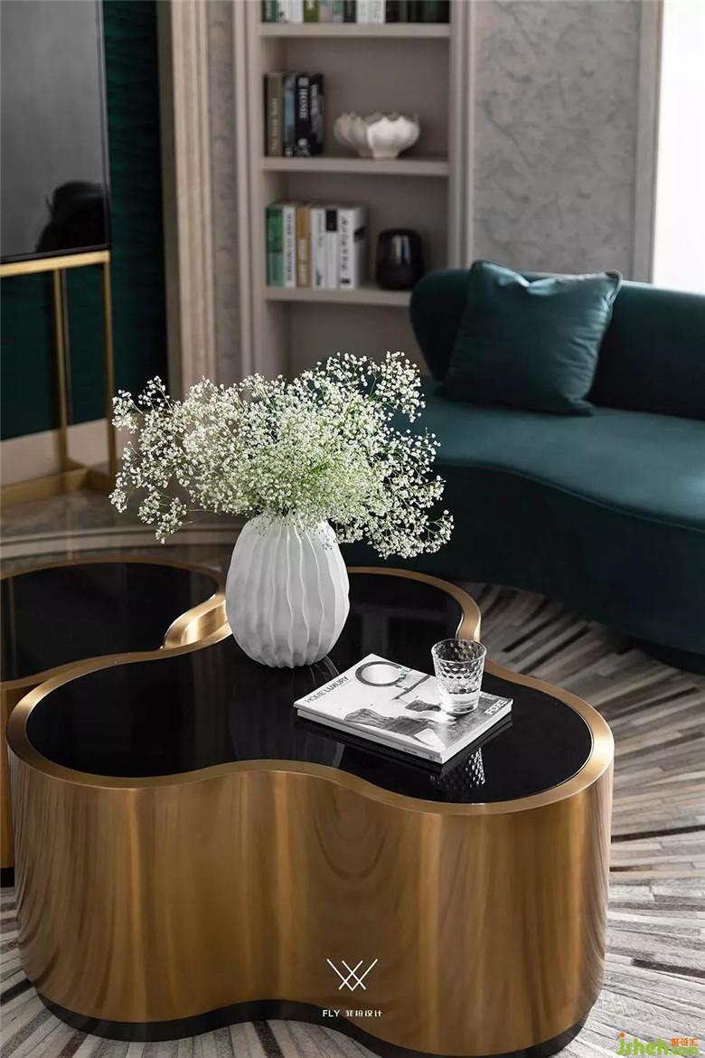 家具參考紐約時尚都市的輕奢氣質,選擇了絨布質感的兩款弧形沙發(fā)互相呼應、金屬材質的茶幾和邊幾、馬毛放射狀圓地毯。背景墻擺放了酒柜形式的儲物裝飾柜,周圍的飾品選擇GLOBAL VIEW的進口花器和果盤,兼具觀賞性和實用性。