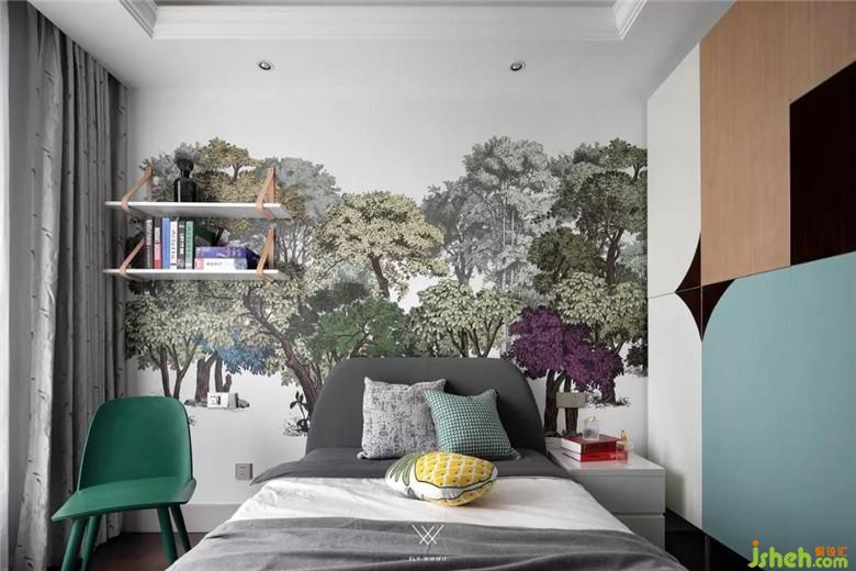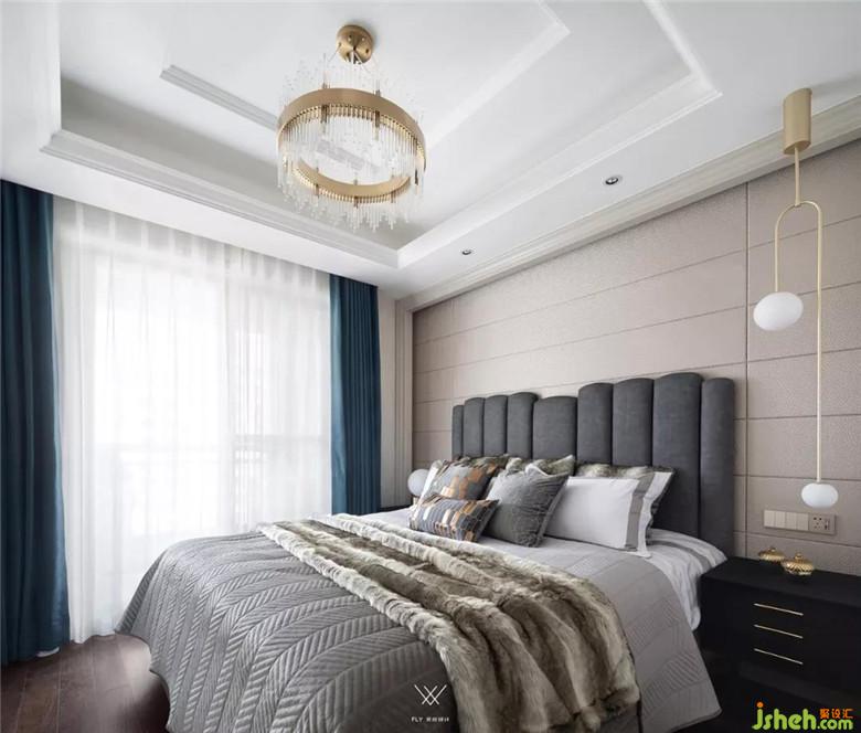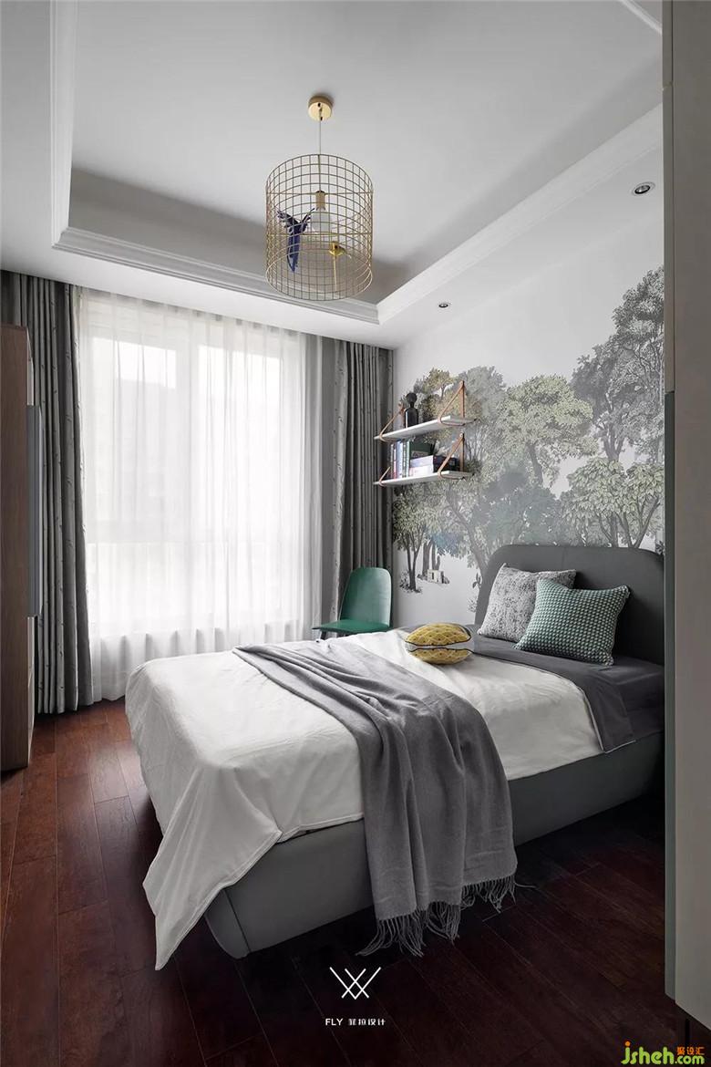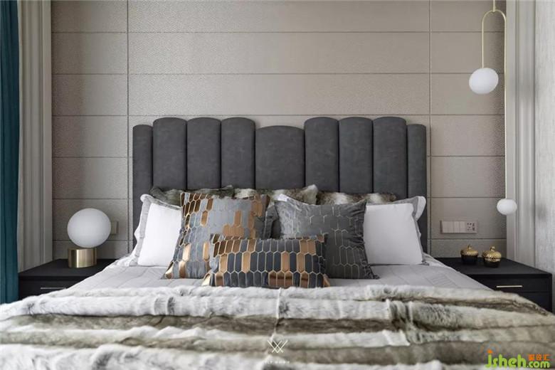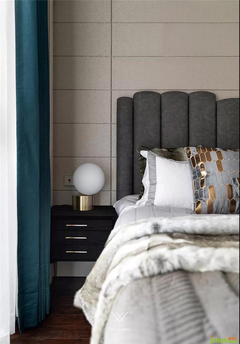主臥保留原本的米色調(diào)硬包背景,在色彩上選擇深灰色和綠色,讓空間不那么單調(diào),平紋真皮床和木質(zhì)床頭柜保證了舒適性和實(shí)用性。原有的白色衣柜比較普通,我們?cè)诶稚献隽烁脑?,換成了輕奢的黃銅玉石款式。