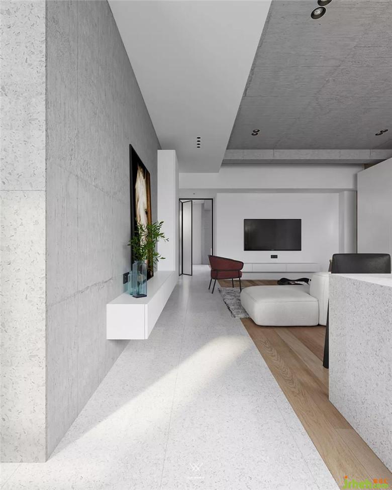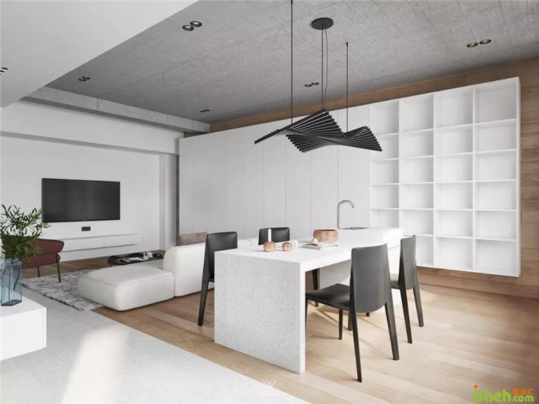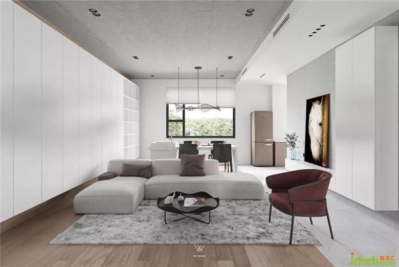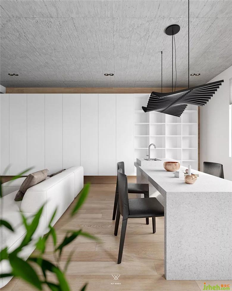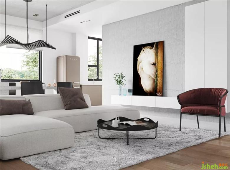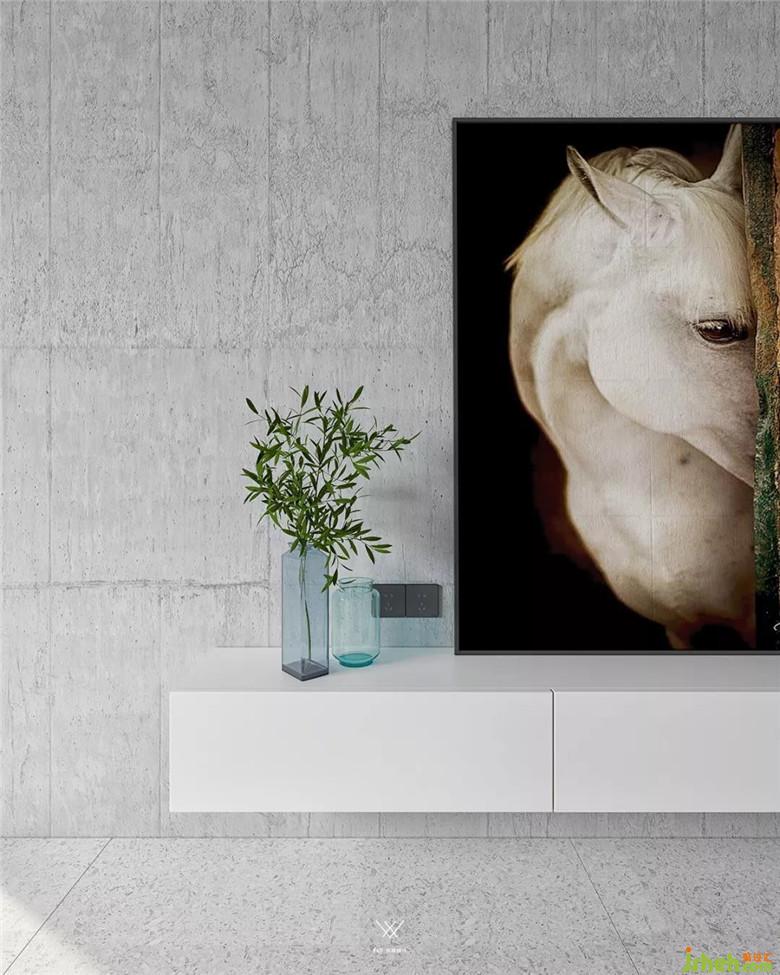 在不同界面打造的軀殼下需要有形的實(shí)體去塑造,才能達(dá)到一個空間的完整。頂界面在視線之上,而且完全暴露在視野之中,所以在視覺上的觀賞和藝術(shù)性表達(dá)方面更加有力度。我們客廳用的是仿水泥的藝術(shù)涂料,一種更原始的藝術(shù)表達(dá)。