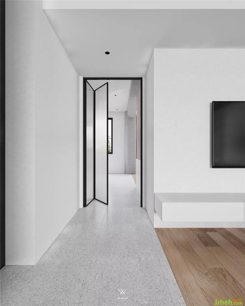 屋主有在臥室看電視的習(xí)慣,需要有電視位置的規(guī)劃,但同時又崇尚開放,自由,融合的空間,不想讓電視墻來阻礙空間開放感,遂把電視機(jī)的位置規(guī)劃在了床右側(cè)墻上(現(xiàn)在放電視機(jī)的位置是原陽臺的下水管。)形成前后關(guān)系。電視機(jī)使用電動伸縮式,來滿足不同場景的實(shí)用需求。