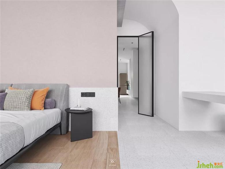走道半圓弧造型與原來房屋的大梁結合,用不同材質介定,突破原結構限制,讓空間充滿藝術感和張力。