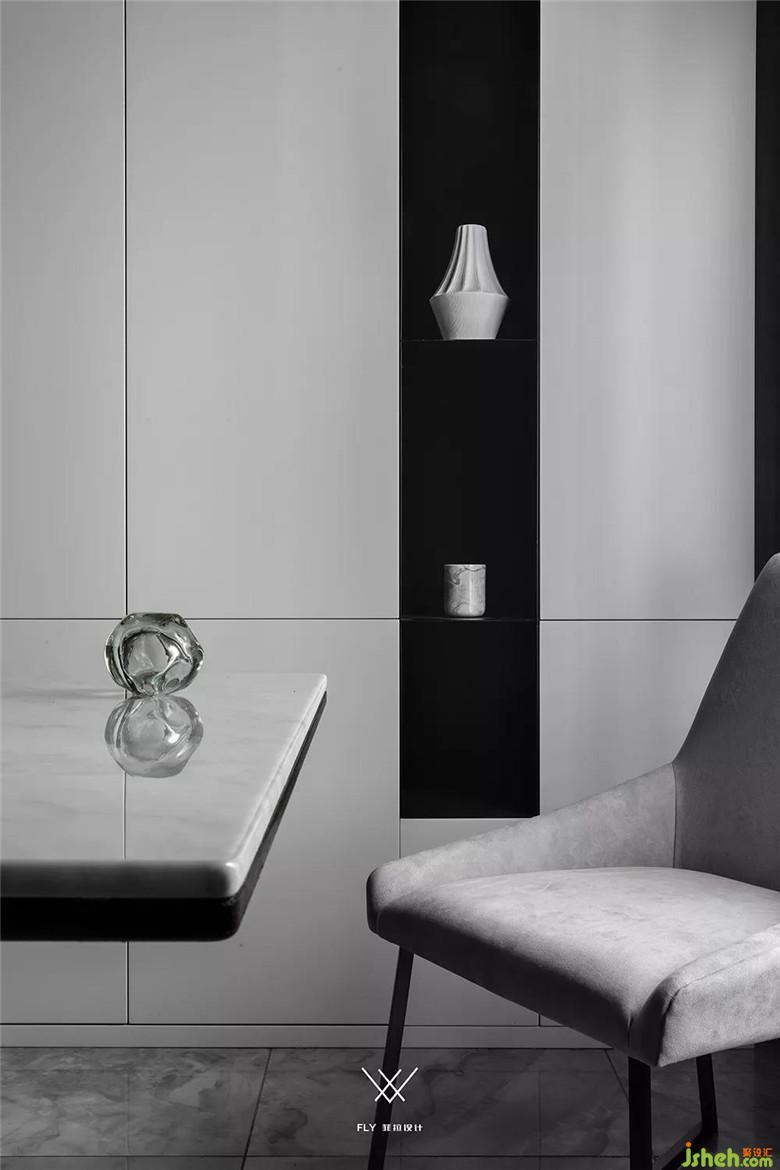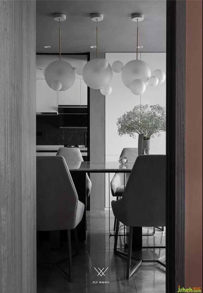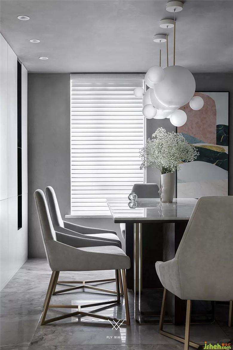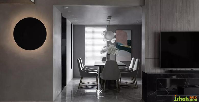 餐廳頂面和玄關(guān)用的是同一款藝術(shù)涂料,可以讓兩個區(qū)域更加整體。這種材質(zhì)的紋理非常細(xì)膩,在餐廳從窗戶進(jìn)來的自然光線照射下更出色。
