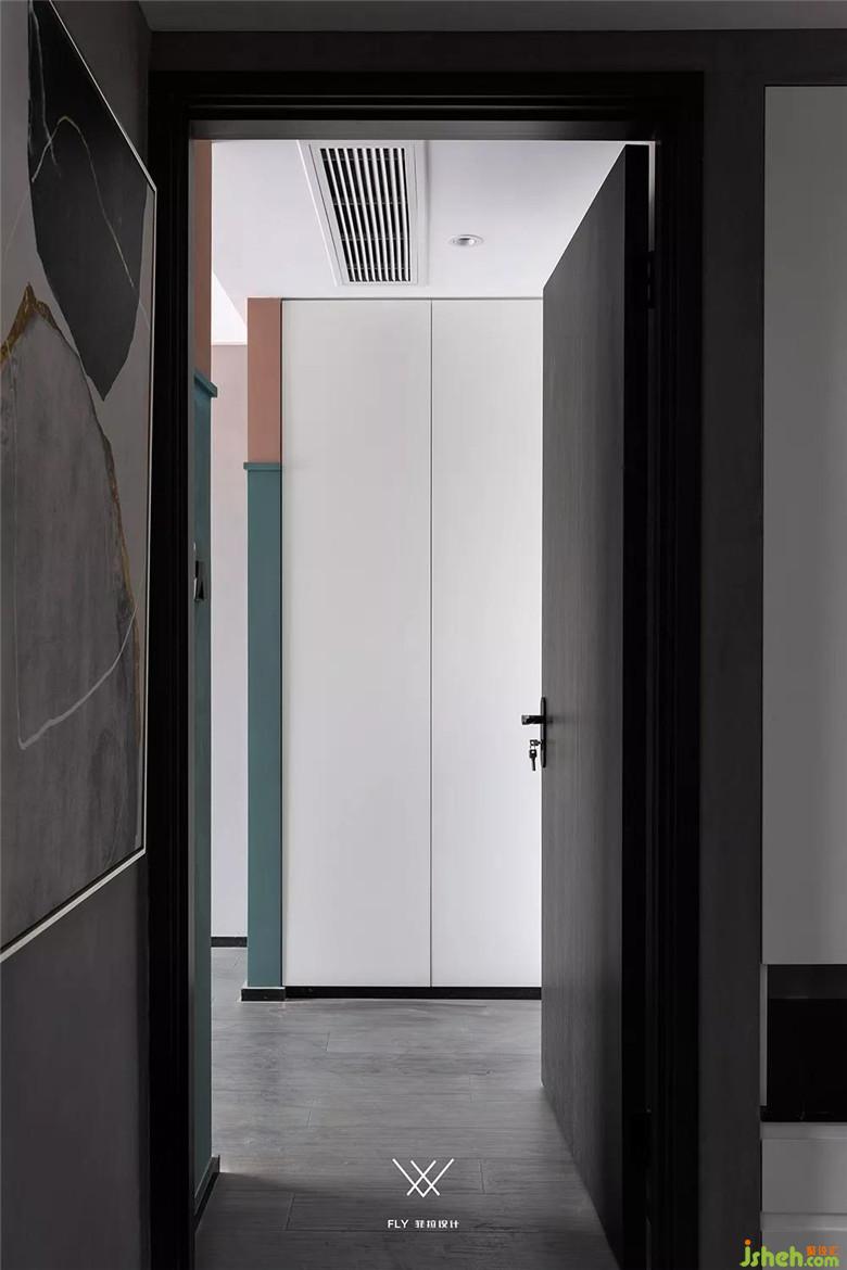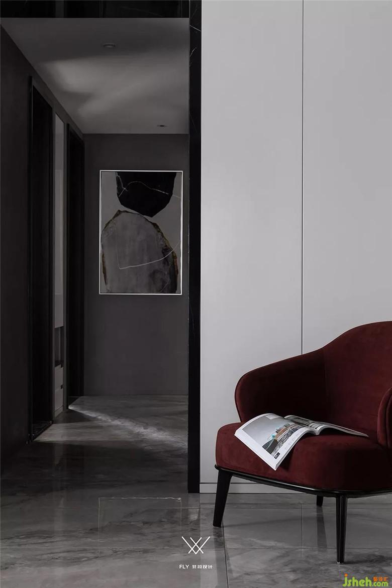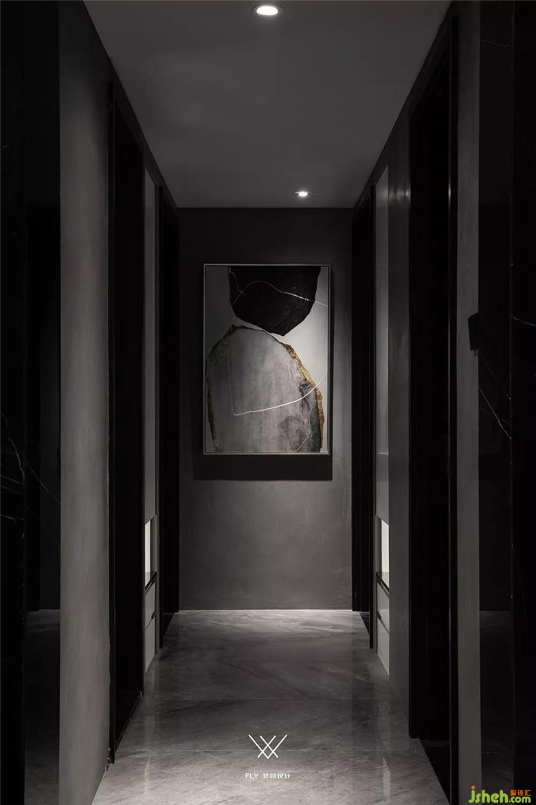 仔細(xì)對(duì)比一下走廊的兩盞筒燈能夠看到他們不在同一條線上。特意讓光線從畫(huà)的右邊向下打,讓這幅畫(huà)的感覺(jué)和整體效果更搭,也形成一個(gè)非常有氛圍的端景。
