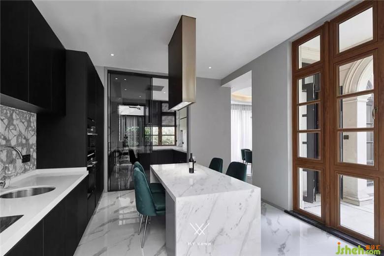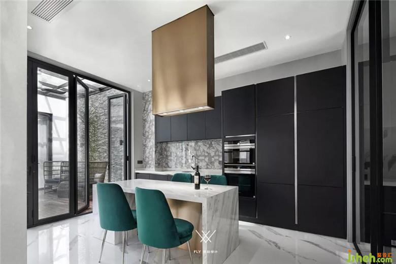 廚房采用中西廚的形式,讓兩種不同的烹飪方式分離,黑白金的色調(diào)搭配讓廚房現(xiàn)代感十足的同時(shí)又帶點(diǎn)小奢華。墨綠色的椅子讓空間更加時(shí)尚,早餐與簡餐在中島就能解決。