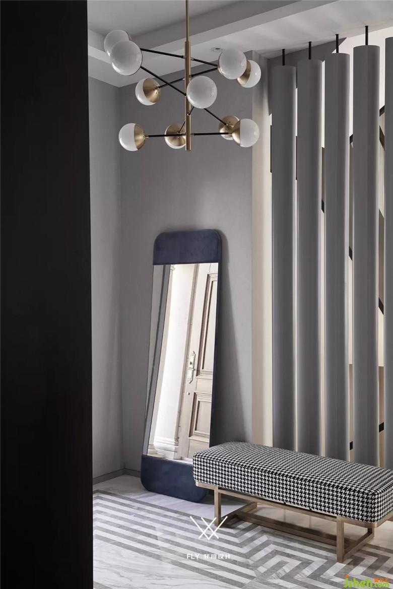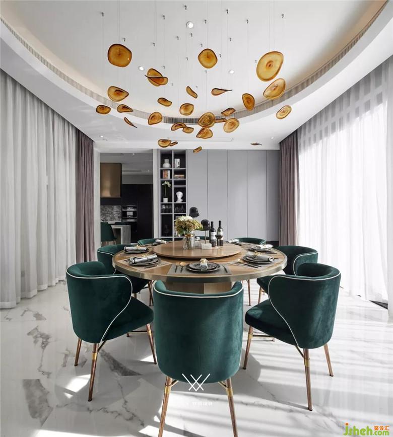 圓形餐桌的設(shè)計(jì)是有考慮到中國博大精深的飲食文化。在增進(jìn)食欲和趣味方面設(shè)計(jì)師也用了一些功力。在秉承整體灰調(diào)的基礎(chǔ)上訂制橘色的半透明琉璃裝飾掛件,它能夠隨著氣流而搖晃,讓空間變得靈動有生機(jī),桌面采用了黃色的細(xì)木紋材質(zhì)。為了提升空間的時(shí)尚感,餐椅則選用了墨綠色的面料,考慮到平時(shí)打理方便餐廳大面積的酒柜進(jìn)行隱藏式設(shè)計(jì),僅一小部分敞開用來展示主人的珍藏點(diǎn)綴空間。
