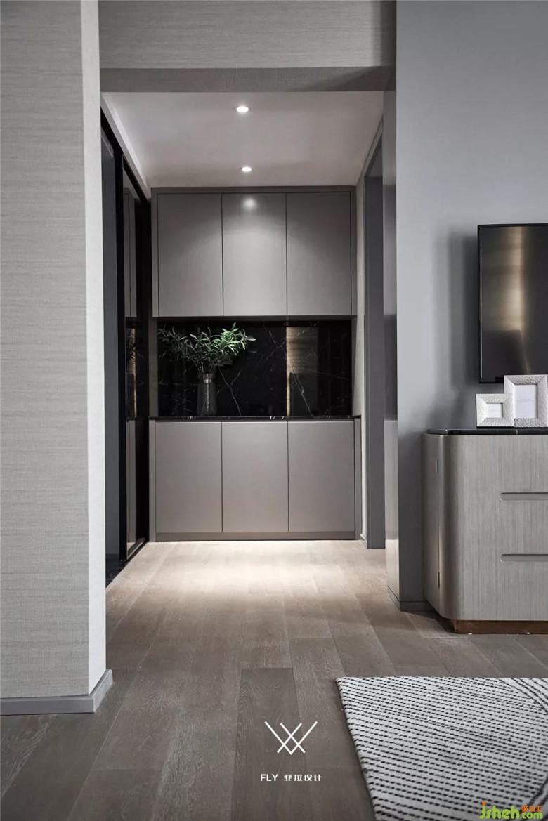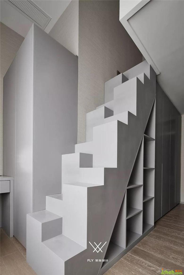衣帽間左右兩排布置,男女主人衣物分開存儲,擁有大面積的采光窗,有獨立的梳妝臺,衣帽間內(nèi)部利用了僅0.7m2的空間設計了一部微型樓梯通往閣樓,增加了大量的存儲空間。