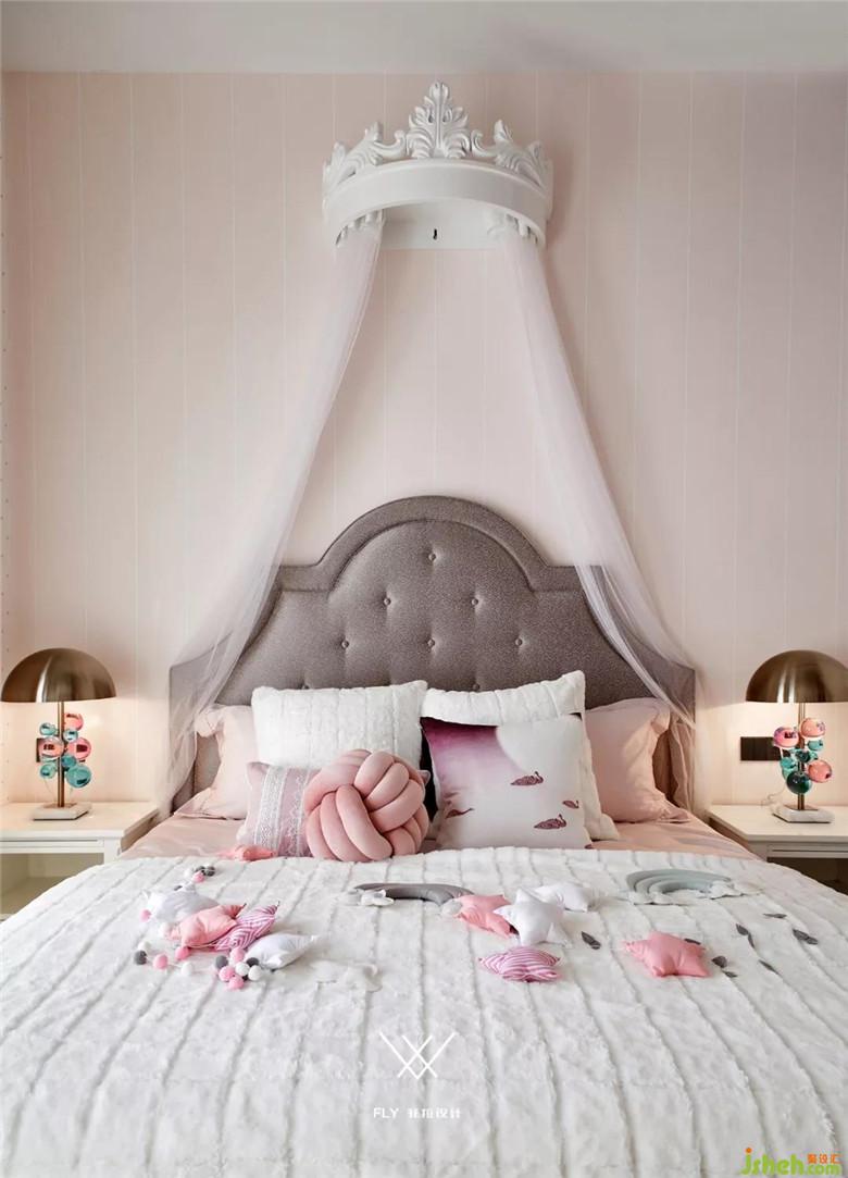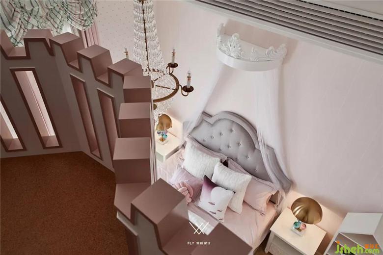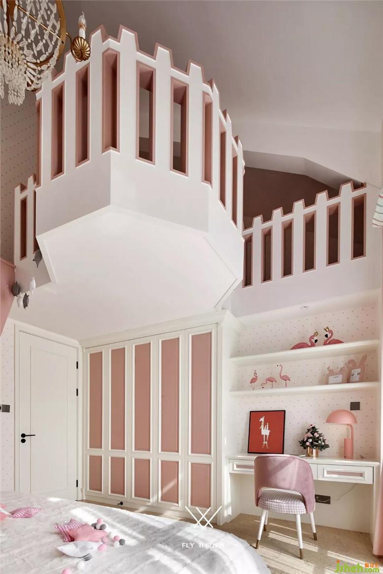 女孩房整體使用了馬卡龍色,不同層次的低飽和度淡粉、淡黃、薄荷綠進行疊加組合,粉色波點壁紙鋪滿整屋十足的公主范,閣樓圍欄設(shè)計靈感源自城堡,這個是屬于個人不可侵犯的空間。