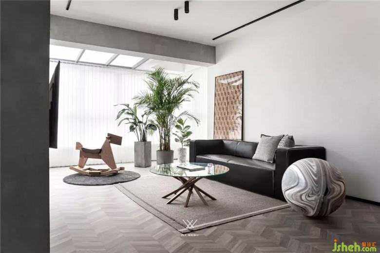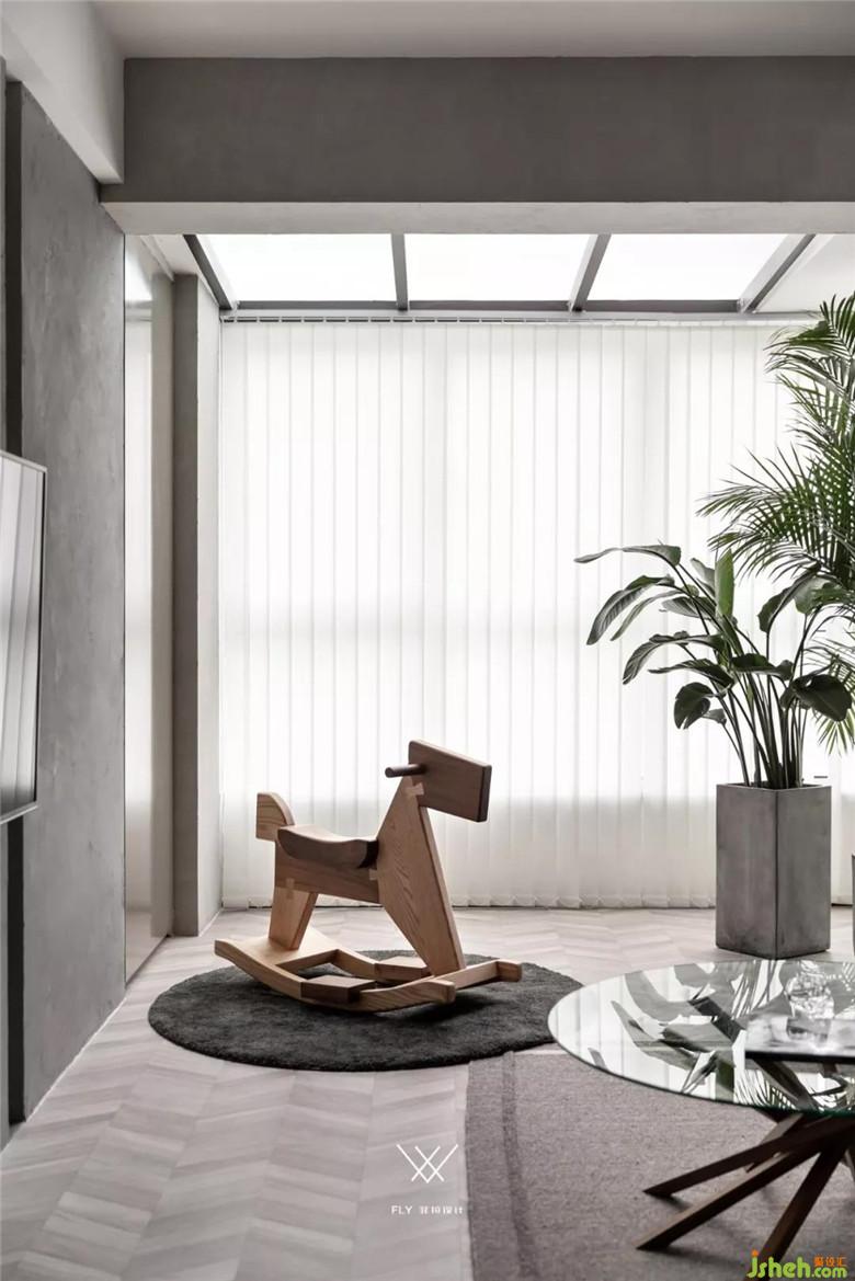 這個(gè)角落是一個(gè)非常治愈的地方,擺放了很多綠植讓人感到很愜意,有一種郊游既視感。業(yè)主選擇的木馬在這里簡(jiǎn)直是一休閑神器。設(shè)計(jì)師的動(dòng)手能力也足可謂強(qiáng),沙發(fā)后面的裝飾畫就是設(shè)計(jì)師創(chuàng)意div。