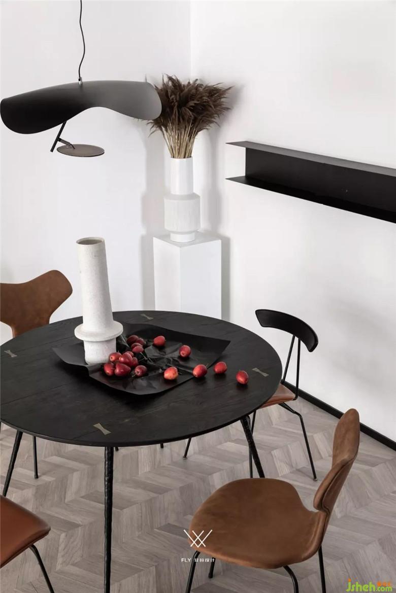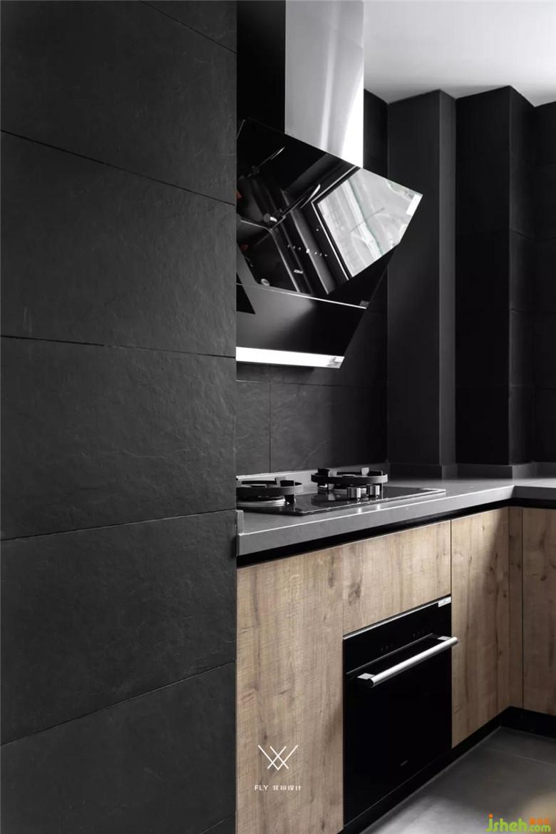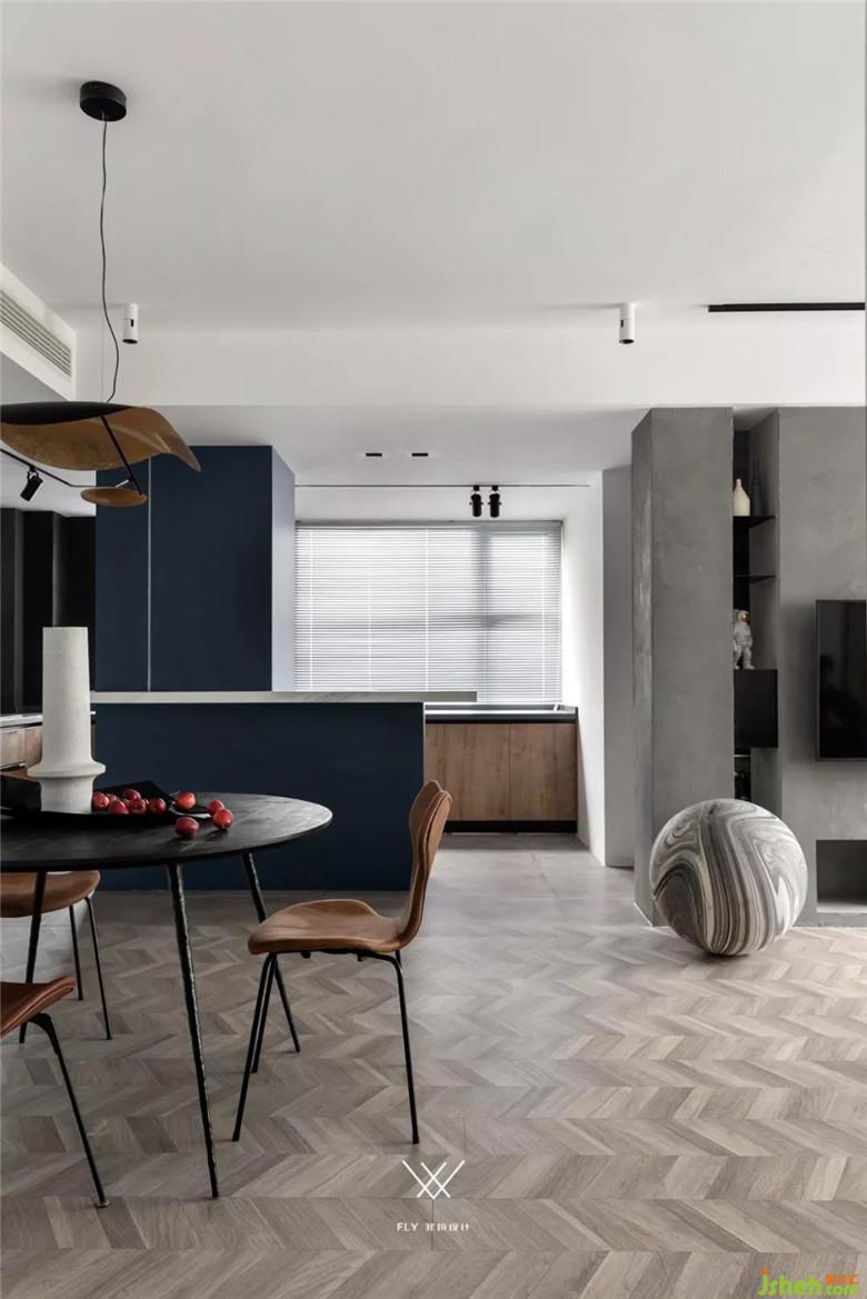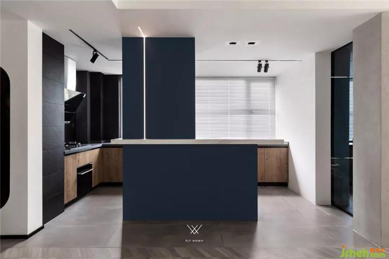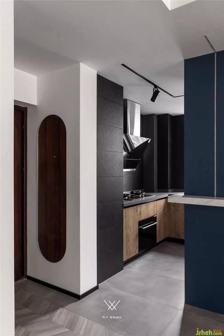 色彩要素在開放式的廚房設(shè)計上有更多的比重,因為客戶給了一定的要求。希望偏男性的色彩,點綴色上就選擇了深藍,它的沉穩(wěn),既能表達出男業(yè)主的性格,同時也能讓空間安靜。藍色作為吧臺結(jié)構(gòu)穿插的主角,配合上開放式廚房的黑色瓷磚和木色門板,通過色彩讓空間在視覺上產(chǎn)生區(qū)域的劃分。