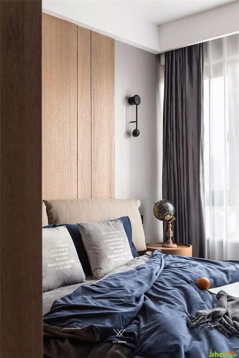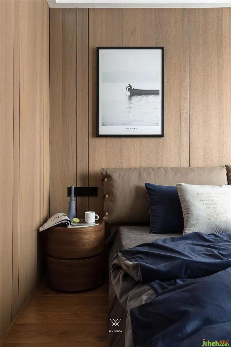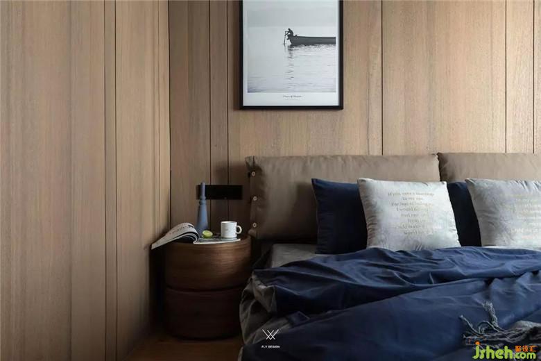 寬松有度,化繁為簡。這兩個(gè)詞用在臥室的設(shè)計(jì)上剛剛好,用由塊面和線條相互結(jié)合來構(gòu)成墻面。飾面板用到左邊床頭柜的時(shí)候剛好止住腳步,沒有再向下延伸,多一分則滿,少一寸則缺。再在整面墻之間掛上一幅頗具內(nèi)涵的掛畫,更顯深刻。