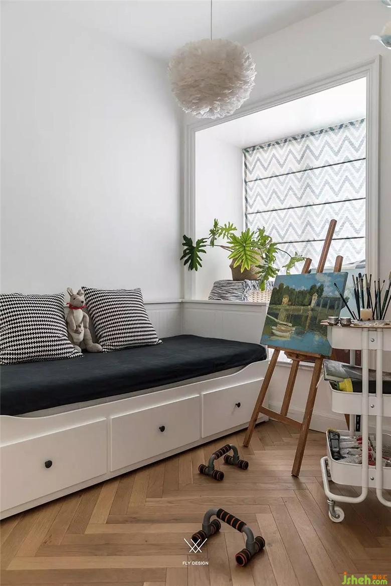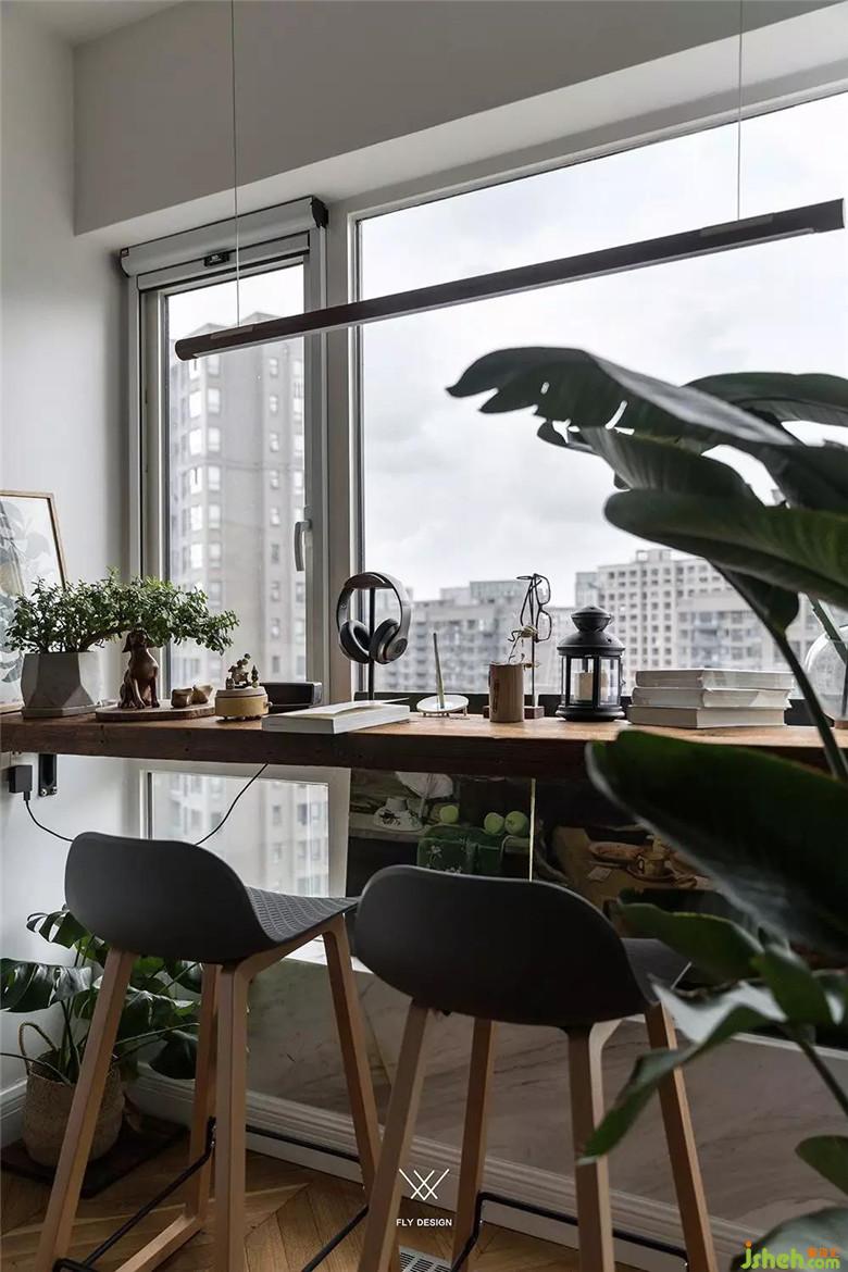 裝修公司在餐廳窗邊做了休閑吧臺兼書桌,桌板是用老原木自己Diy的,坐在這兒,耳邊響起輕快的音樂,看著喜歡的書,這將是多么美妙。從這里跨過餐廳,走入客廳,到達陽臺,地面?zhèn)鱽淼氖墙z絲暖意,也許這就是幸福的感覺。