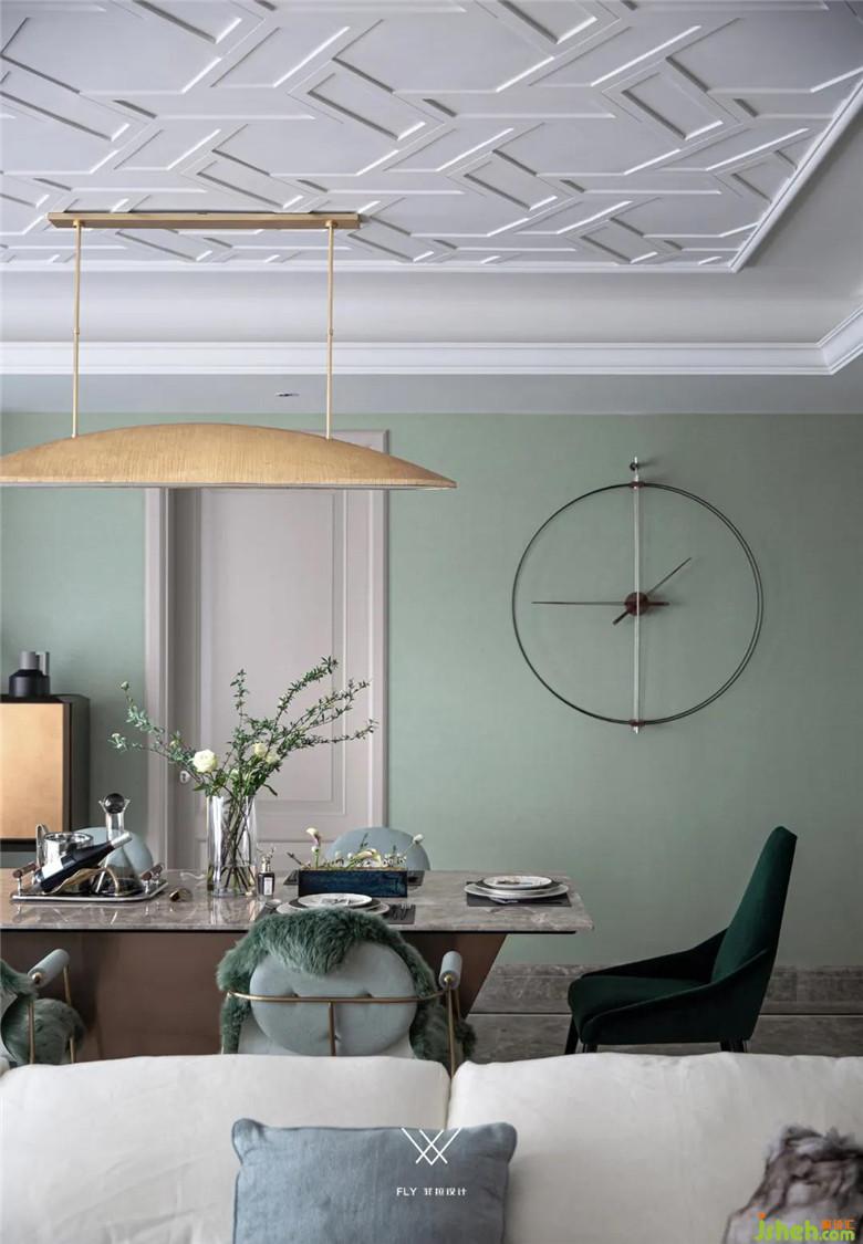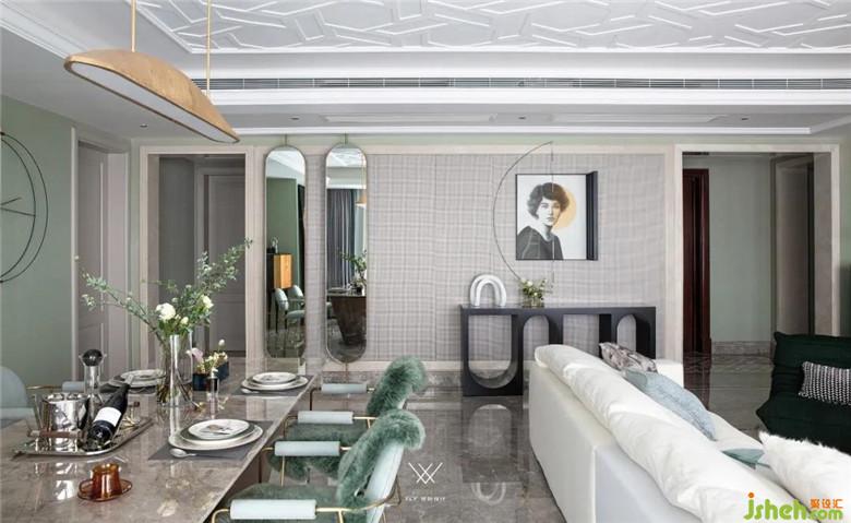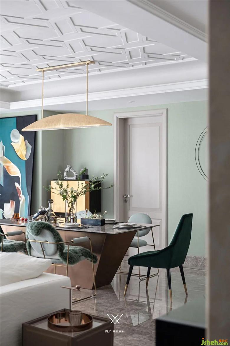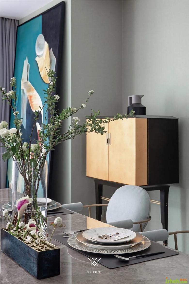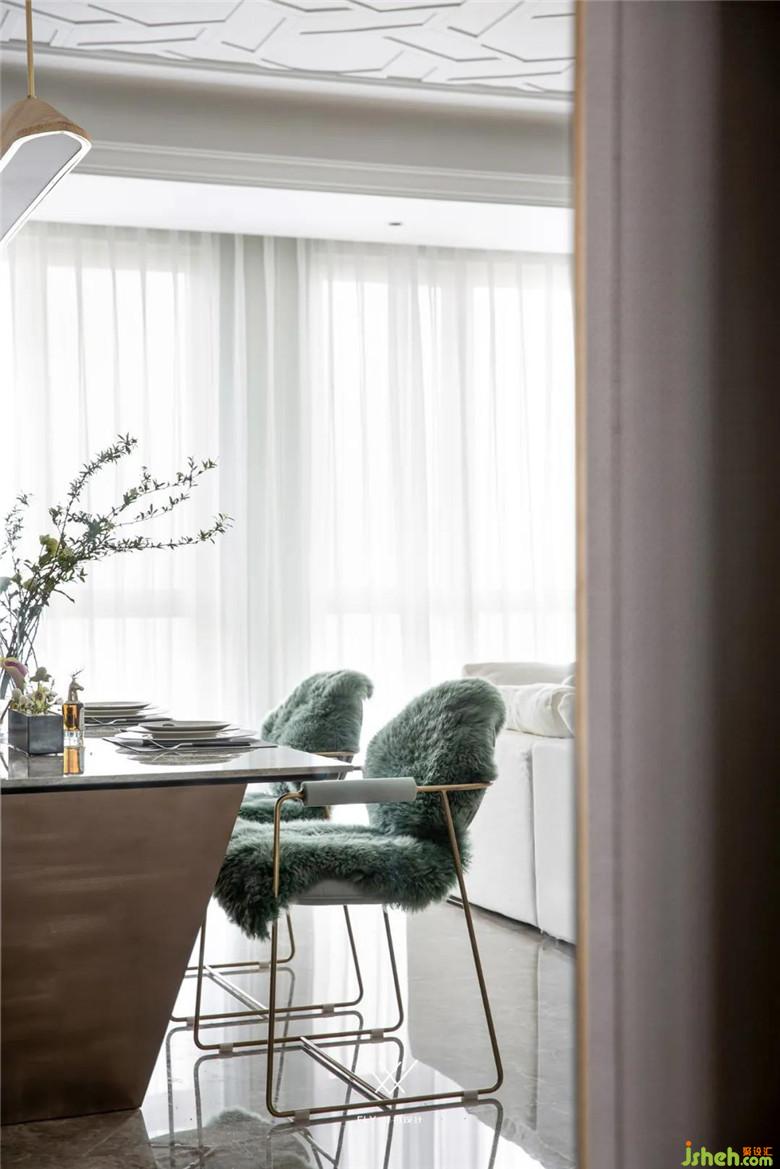 餐廳這里的吊燈原本就存在,而且業(yè)主喜歡這個吊燈的金屬色澤,所以裝修公司沒有把它進(jìn)行更換而是選擇同樣質(zhì)感的高腳酒柜和餐椅相配合,能夠更好統(tǒng)一。