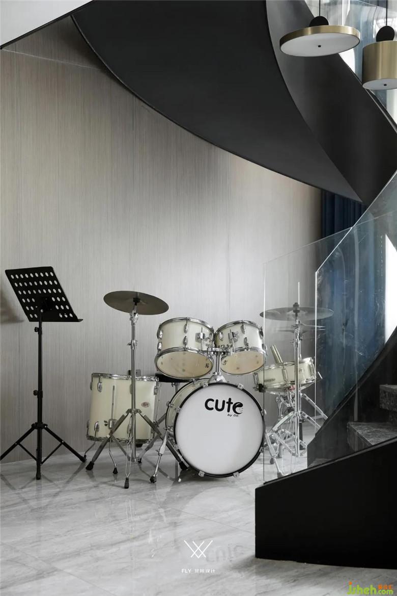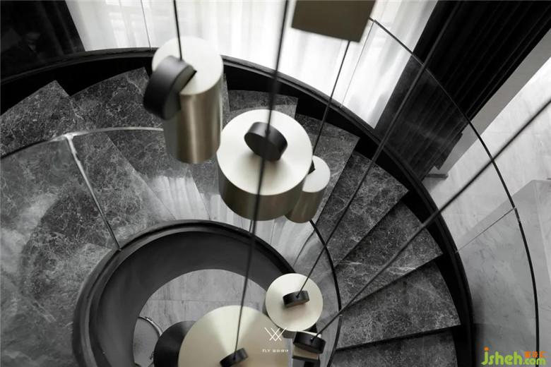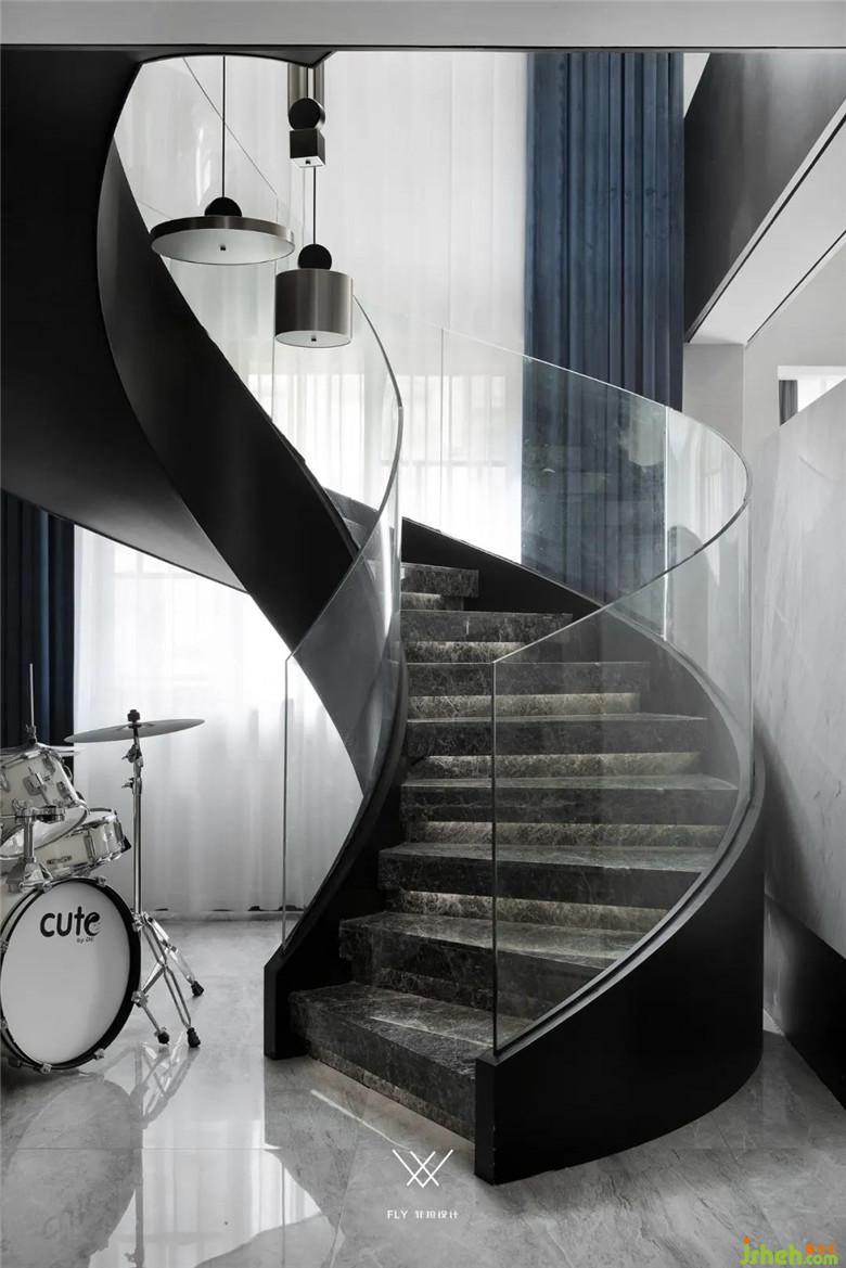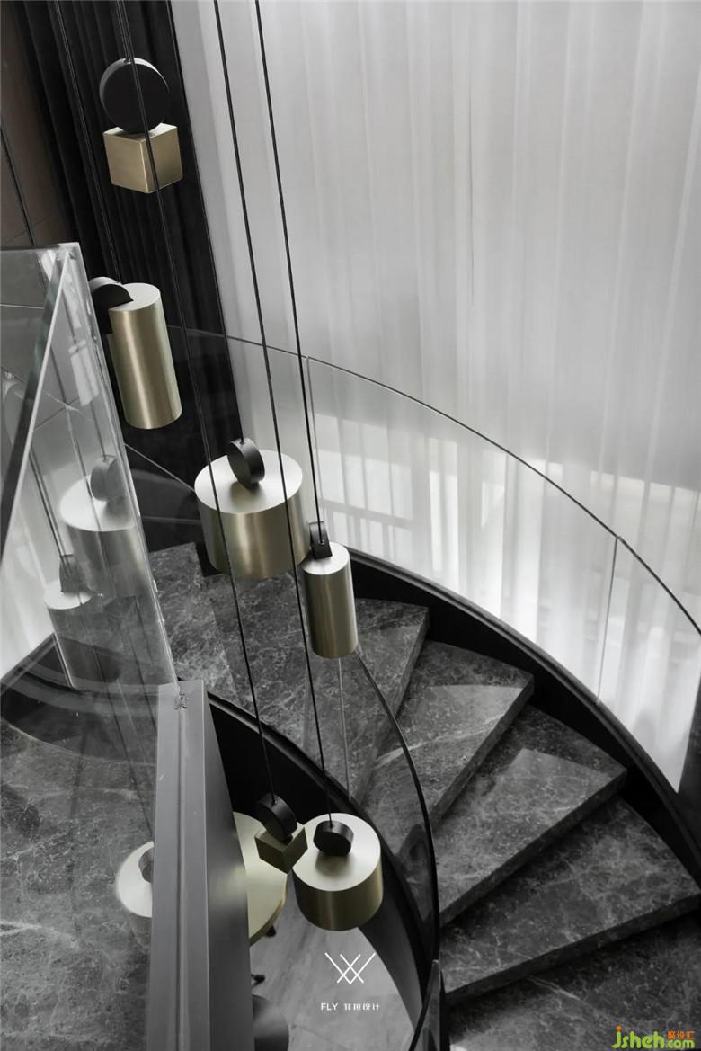 在做客廳的旋轉(zhuǎn)樓梯同樣也遇到一些問題,旋轉(zhuǎn)樓梯施工難度大、新田沒有施工隊可以做符合設計意圖的弧形樓梯,業(yè)主也有過動搖更改設計的念頭,在裝修公司的堅持下,客戶輾轉(zhuǎn)找到了找了當?shù)亟ㄖ哼M行樓梯結構的設計和實施,讓設計想法得以實現(xiàn)。設計師給出踏步大理石是材料小樣,客戶在本地找不到合適的石材版型,專程到長沙采購。扶手是整體鋼化玻璃的設定,當?shù)匾舱也坏娇梢砸惑w成型的玻璃供應商,采取了分段安裝拼接的方式完成其設計。