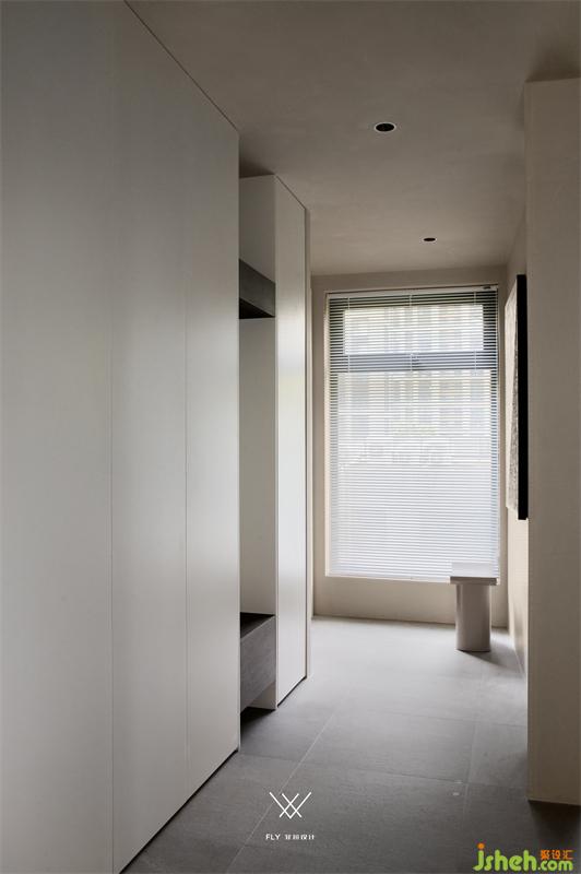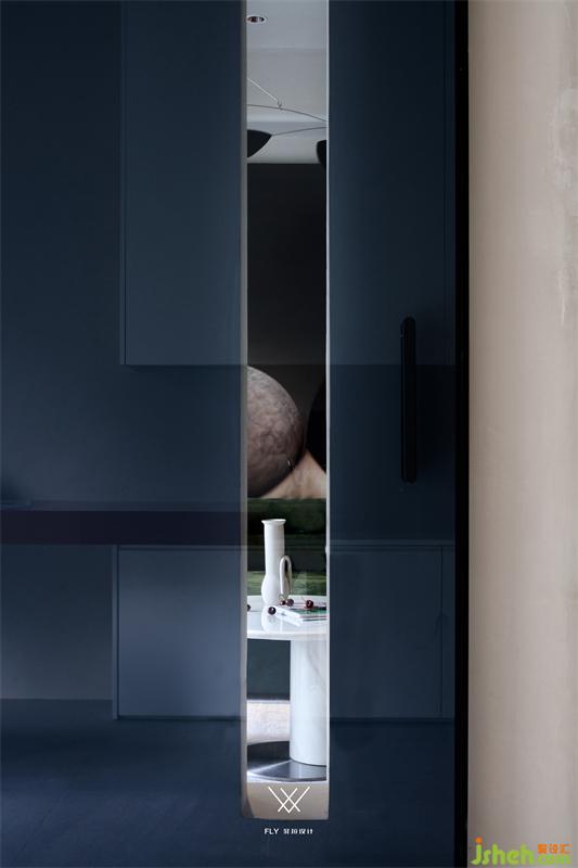 入戶廊道與廚房之間隔墻,一體兩個(gè)立面形成小V角,以微調(diào)的隱晦手法擴(kuò)展廊道,不限于入戶端景的局部處理,更是關(guān)照幾尺廊道的入戶感受,趣味傳達(dá)開闊通透,玻璃隔斷顯露的廚房配色與比例分割,看似無意識的裝飾巧合,不乏殫精竭慮的自然手法填充空間情緒。