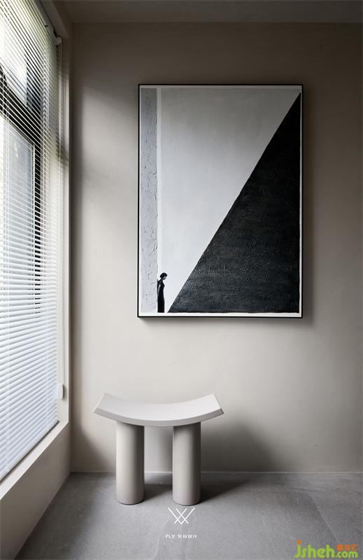 Integration of space integration, roaming and interaction of breath, green outside the window of the room, the color of the sofa, the surface of the material, and light dancing, shadow mottled, painting is also painting.