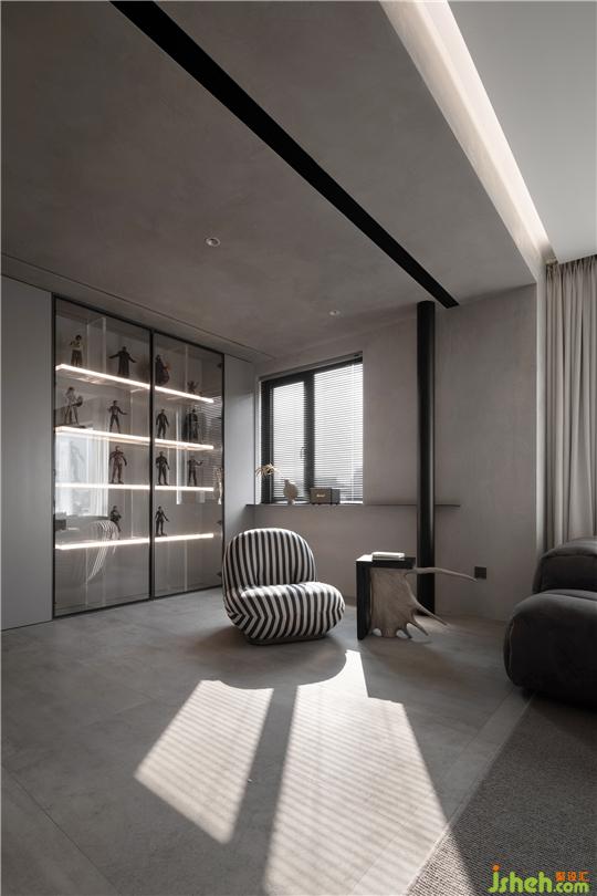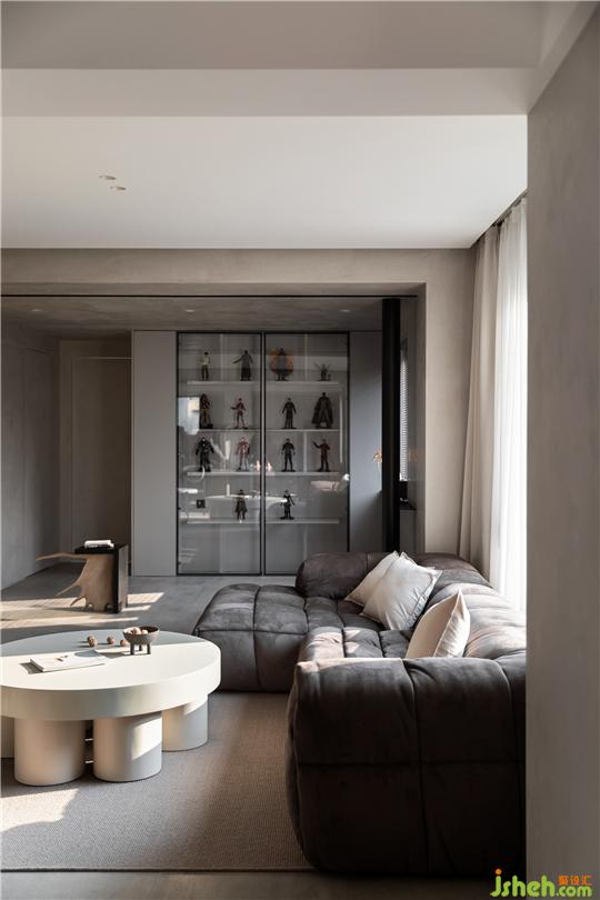 杭州家居設計師將原本狹小的臥室,打通納入客廳區(qū)域,作為休閑區(qū)以及業(yè)主手辦的展示區(qū),讓整體空間更加的開闊通透。當室外光線透過玻璃窗進入室內,光與影在紋理之間的凹凸縫隙彼此交織,講述一個有溫度的居住空間。簡約的家具之間保持著彬彬有禮的距離,極致舒適的畫面貫穿每一個空間,讓每一件物品彰顯藝術陳列的視覺。