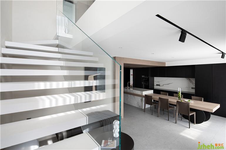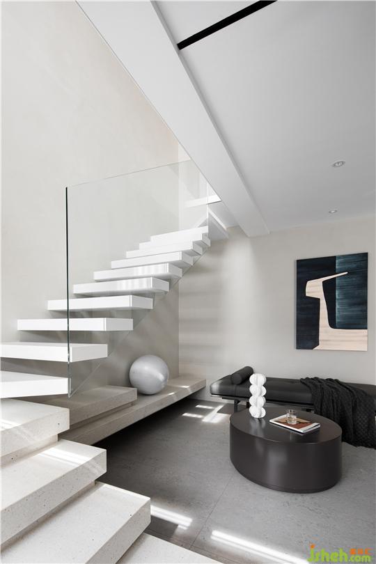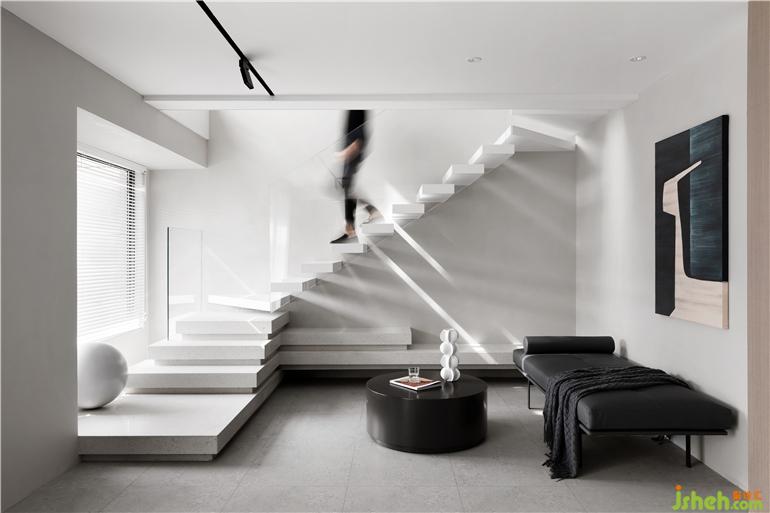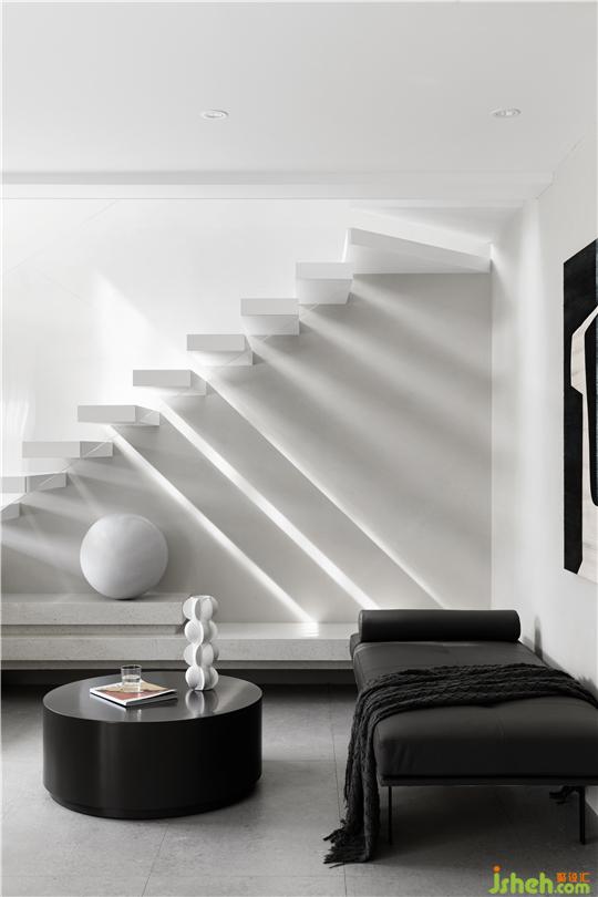 杭州復(fù)式設(shè)計(jì)打破傳統(tǒng)樓梯認(rèn)知,從“礙事”工具梯一躍成為整個(gè)空間最具視覺(jué)語(yǔ)言的主角。每階獨(dú)立成塊嵌入墻體,伴隨著上下兩層窗外灑進(jìn)的豐盈光線(xiàn),陽(yáng)與陰、明與暗、光與影的互動(dòng),階梯視覺(jué)上的漂浮狀與拾步而上的踏實(shí)感,神圣、浪漫又自在。