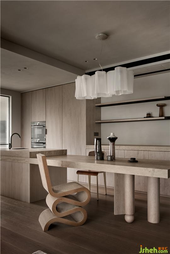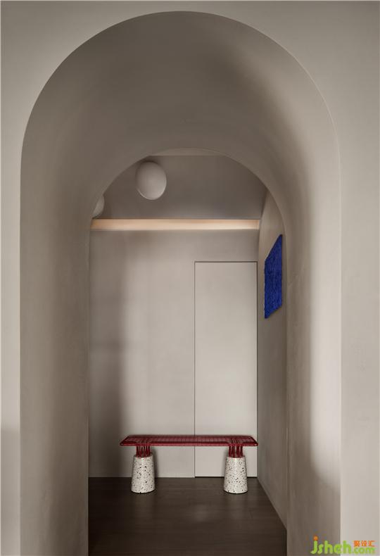 玄關(guān)走廊頂部拱形曲面、懸浮球、藍紅撞色,一場概念性主題由此展開;原有玄關(guān)方正狹小,重新規(guī)劃空間,延伸玄關(guān)進深,杭州輕奢設(shè)計以藝術(shù)長廊的形式載以沉浸式美學(xué)。而改變之后的玄關(guān)動向給西廚餐廳留有足夠的空間,滿足了她對于有中島西廚的喜愛。